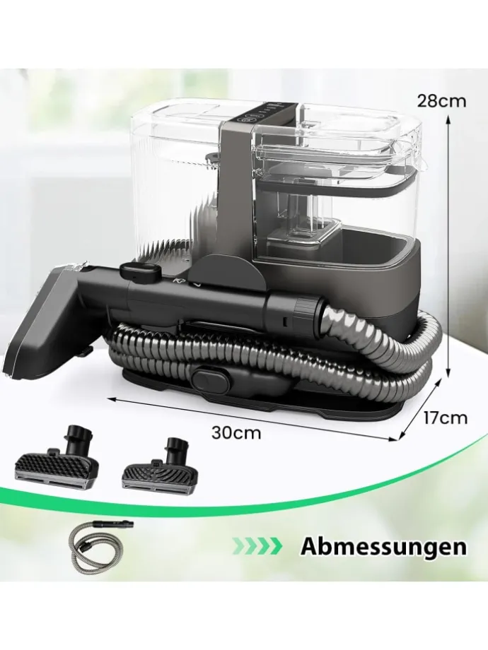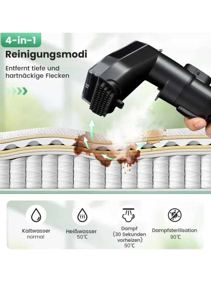 Erleben Sie ein makelloses Zuhause mit diesem leistungsstarken Polsterreiniger, ausgestattet mit einem 1800W Motor, der eine starke Saugkraft von über 17kPa gewährleistet und auch hartnäckige Flecken mühelos entfernt. Die abnehmbaren Frisch- und Abwassertanks minimieren Unterbrechungen, machen Nachfüllen schnell und einfach. Außerdem sind die vielseitigen Bürstenköpfe für Teppiche, Sofas und schwer erreichbare Ecken konzipiert. Mit 4 vielseitigen Reinigungsmodi – Kaltwasser, Heißwasser, Dampf (bereit in 30 Sekunden) und Dampfsterilisation – können Sie Ihre Reinigungsmethode individuell anpassen für sanftes Ausspülen oder Tiefenreinigung. Das lange Stromkabel und der Schlauch bieten erweiterte Reichweite, während das leichte und tragbare Design eine mühelose Handhabung sicherstellt.