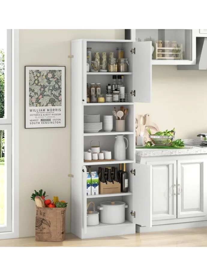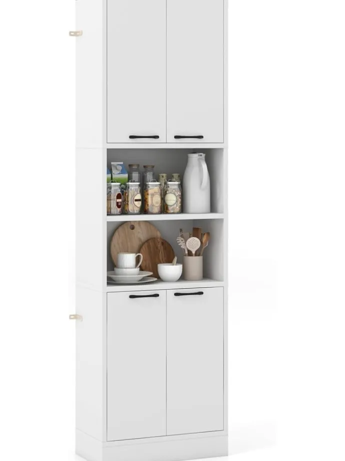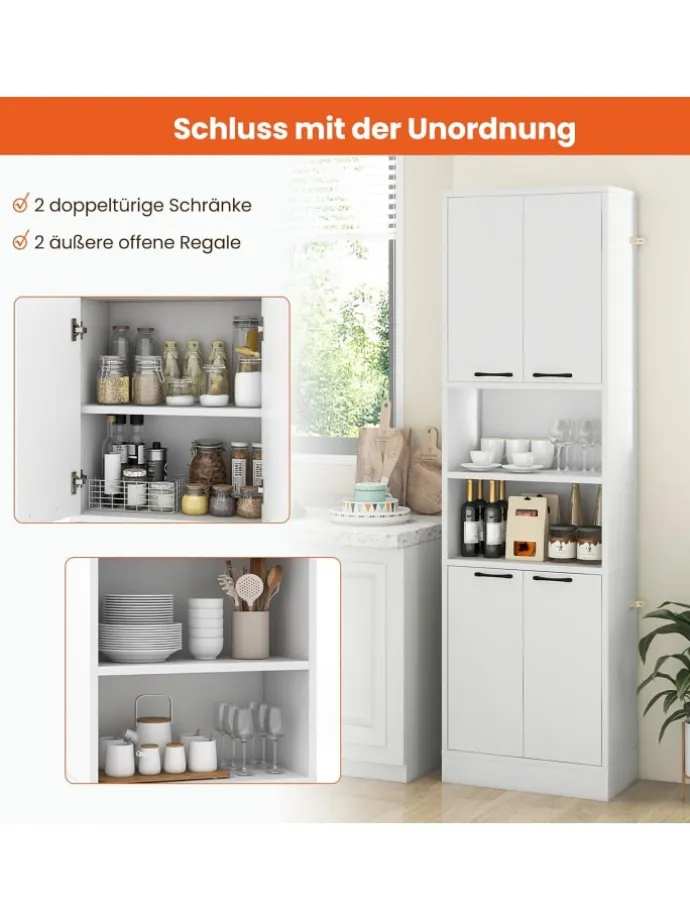 Dieser Küchenschrank bietet Ihnen reichlich Stauraum, ohne zu viel Bodenfläche einzunehmen. Er verfügt über 2 Doppeltürschränke mit Regalen und 2 offene Außenregale, um Ihren Stauraumbedarf zu decken. Er dient nicht nur als Buffetschrank, sondern eignet sich auch gut als Vorratsschrank, Kaffeebar, Vitrine oder Badezimmerschrank. Außerdem verhindern 4 Türen, dass Gegenstände herunterfallen, und halten die Gegenstände im Inneren sauber. Es gibt leicht zu greifende Griffe und Metallscharniere für müheloses Öffnen und Schließen. Der robuste Sockel und die rutschfesten Fußpolster sorgen für ausreichend Stabilität. Und schließlich können Sie den Schrank mit dem Kippschutzsystem fest an der Wand befestigen.