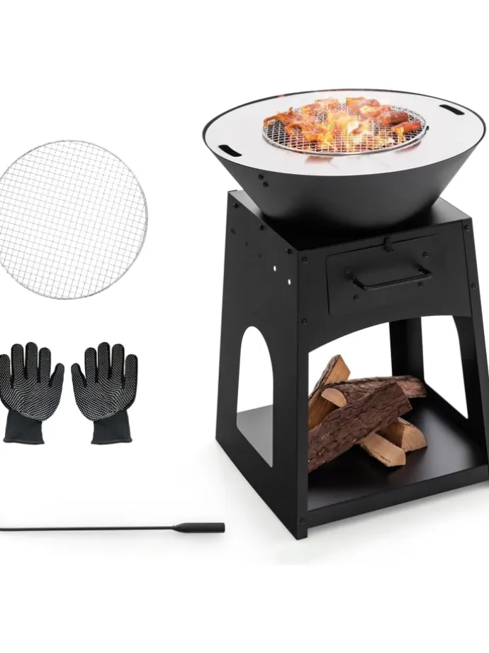 Die Feuerstelle besteht hauptsächlich aus hochfestem verzinktem Metall und ist daher sehr langlebig. Die abnehmbare Oberplatte und der Grillrost machen sie zu einer vielseitigen 2-in-1-Feuerstelle zum Heizen und Grillen, während die praktische Ascheauffangbox und das Brennstofflagerfach die Wartung erleichtern. Und Sie können die Flexibilität genießen, Pellets, Holz oder Holzkohle als Brennstoff zu verwenden. Diese funktionale Feuerstelle ist perfekt für jeden Anlass, von Gartenpartys bis hin zu Picknicks und Campingausflügen. Erfreuen Sie sich an Wärme und gutem Geschmack mit diesem unverzichtbaren Outdoor-Begleiter.