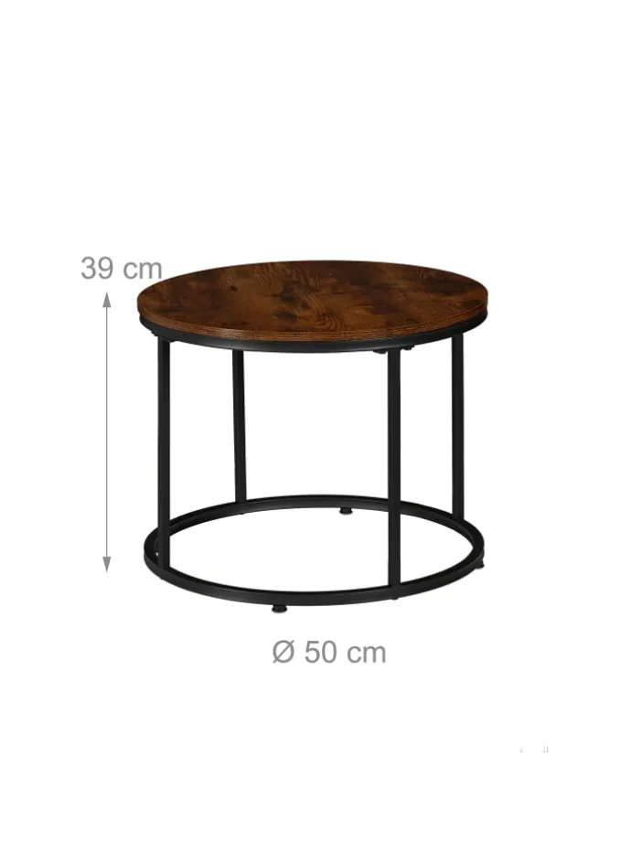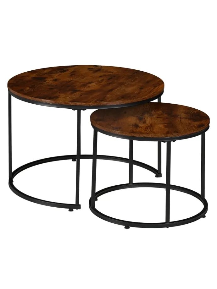 Sorge mit den Beistelltischen im Industrial-Design für Wohlfühlatmosphäre in Deinem Wohnbereich. Getränke, Bücher, Blumen oder Deko finden auf diesen eleganten Couchtischen im 2er Set mühelos Platz und sind so stets griffbereit. Dabei überzeugen die runden Satztische durch ihre Tischplatten in brauner Holzoptik in Kombination mit dem schwarzen Metallgestell. Mithilfe der verstellbaren Füße lassen sich Unebenheiten im Boden einfach ausgleichen.