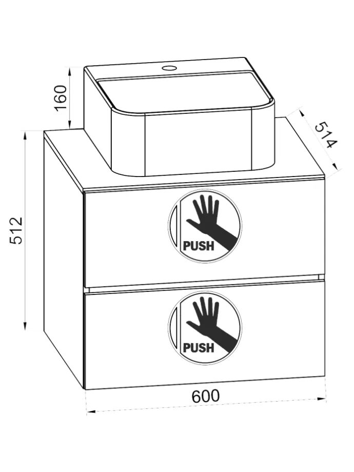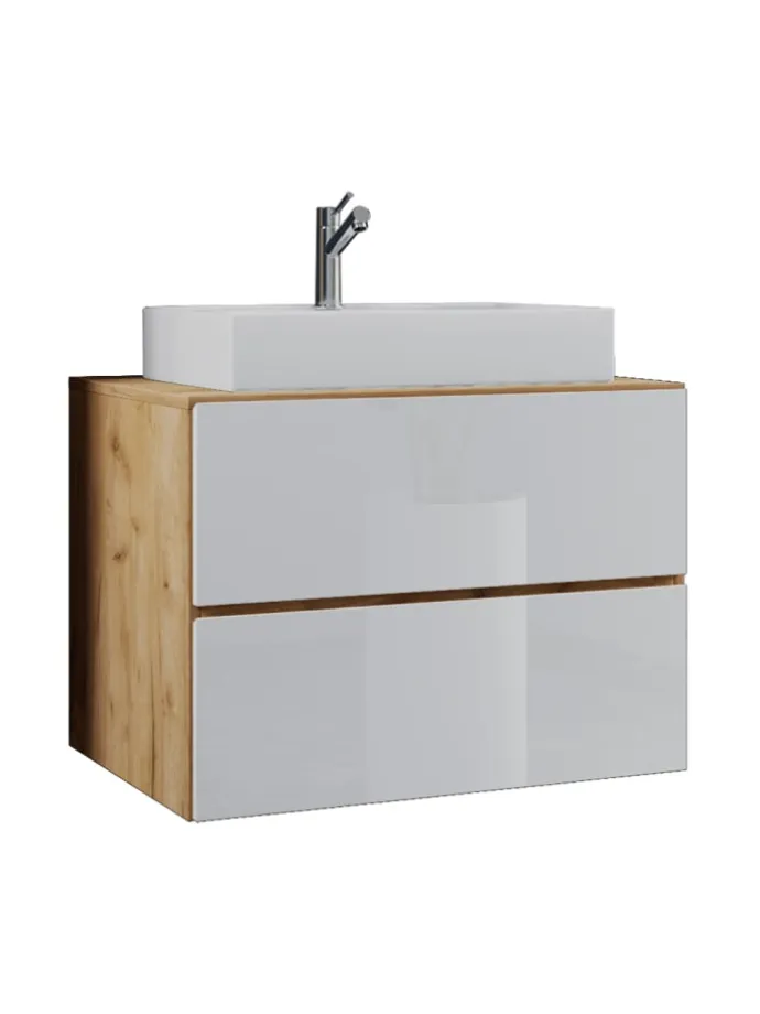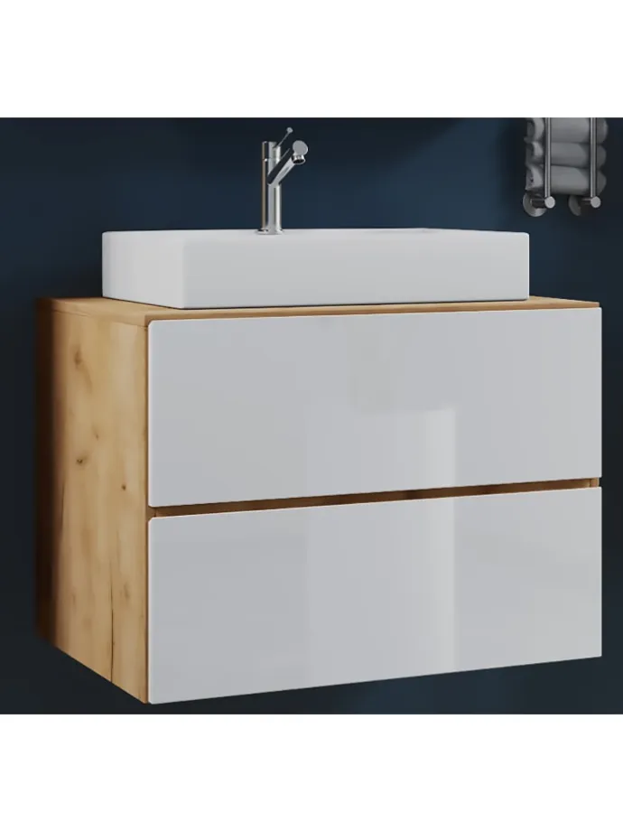 Das Badmöbel-Set besteht aus einem Unterschrank mit zwei Schubladen auf robusten Metallschienen. Das Möbel ist mit einer praktischen Push-to-open-Funktion ausgestattet.