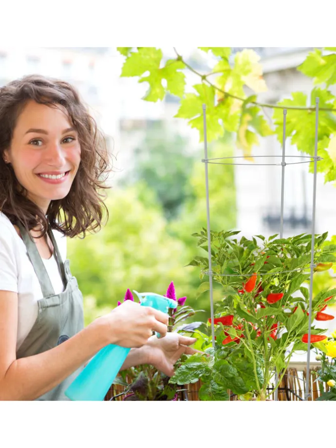 Schenke Deinen rankenden Kübelpflanzen Halt und Form mit dem 2er Set Rankhilfen für kleine Zier- und Nutzpflanzen. Das Rankgerüst aus Metall und Kunststoff ist vielseitig einsetzbar, ob als Tomatensäule für die Cherrytomaten auf dem Balkon oder als Zimmerpflanzenrankhilfe für die Bergpalme im Wohnzimmer. Einfach aufklappen und einstecken. Schon sicherst Du ausladende Sträucher oder stützt zarte Paprikapflanzen. Der niedrige Tomatenkäfig eignet sich auch für den Einsatz auf dem Beet im Garten.