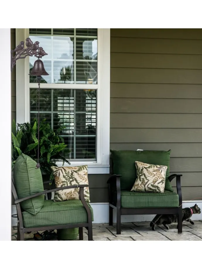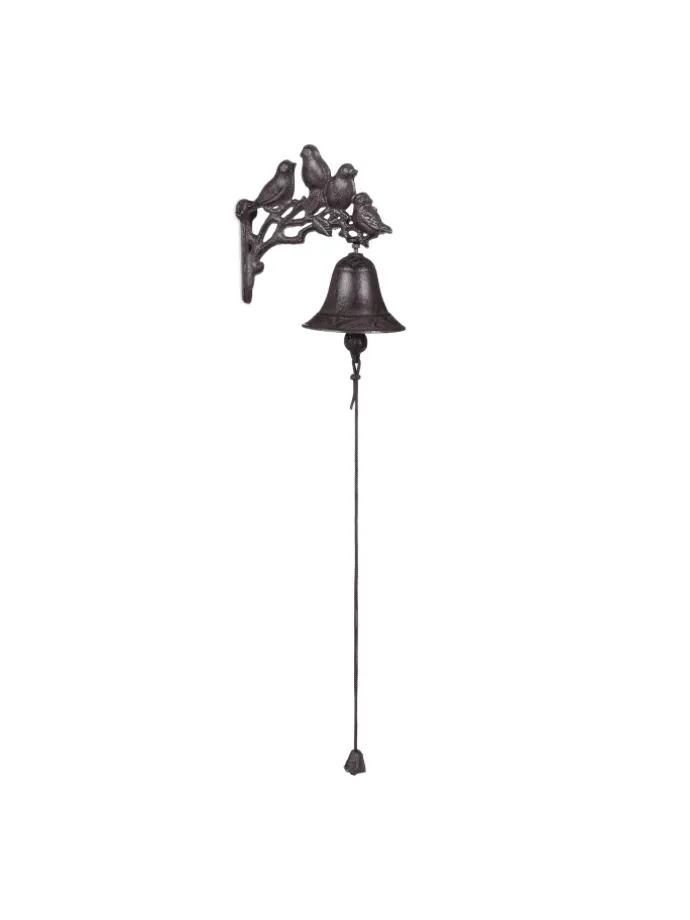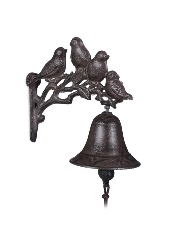 Die Türglocke aus Gusseisen mit den hübschen Vögeln verschönert Eingangsbereiche, Terrasse und Garten. Neben Tür und Tor an der Wand befestigt, wirkt die Glocke nicht nur einladend, sie kann mit ihrem hellen und lauten Klang auch dazu dienen, Freunde und Familie zusammenzutrommeln. In antiker Optik versprüht die Eisenglocke Vintage Charme und dekoriert im nostalgischen Landhausstil Ihren Außenbereich. Dank der drei vorgebohrten Löcher kann die wetterfeste Metallglocke leicht angebracht werden.