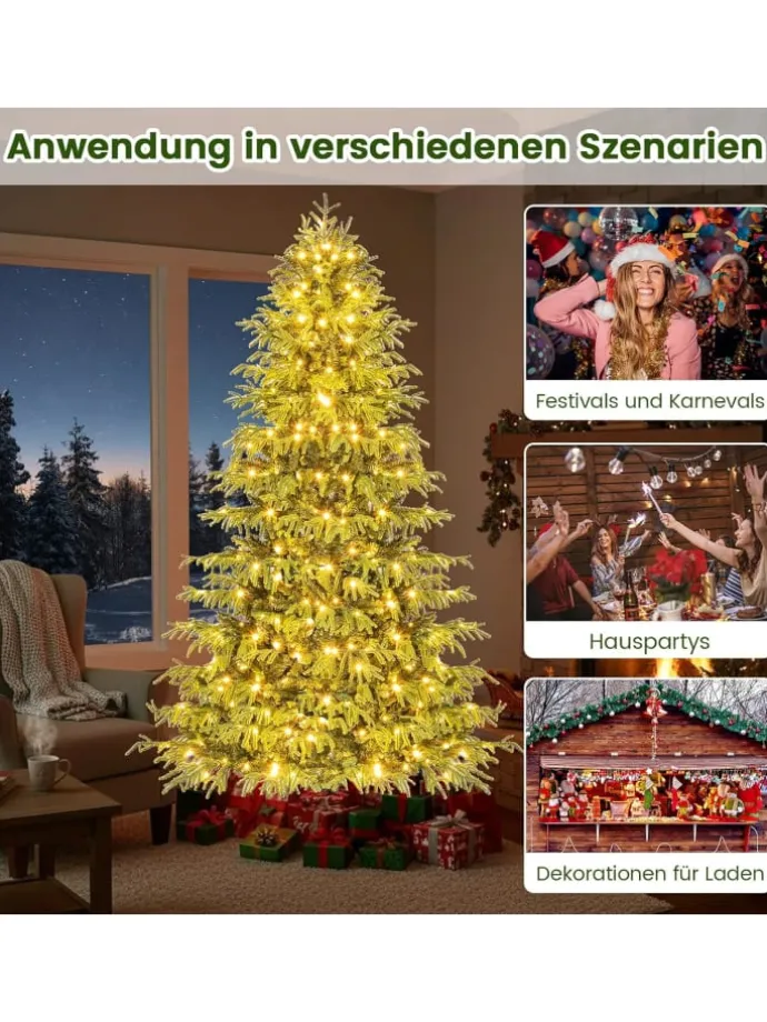 Begrüßen Sie die Festtagszeit mit dem klassischen künstlichen Weihnachtsbaum. Mit seinem hochwertigen PE-Laub, das für einen naturgetreuen Effekt sorgt, sieht dieser Baum bemerkenswert realistisch aus. Darüber hinaus sorgen 370 warmweiße LED-Leuchten, betrieben über einen Adapter, für energiesparendes, konstant warmes Licht. Das klappbare Design ermöglicht es, die Zweige leicht auszuklappen und zu fixieren. Mit 1090 Zweigspitzen aus langlebigen und allergikerfreundlichen Materialien behält der 210 cm Baum jahrelang sein volles Aussehen.