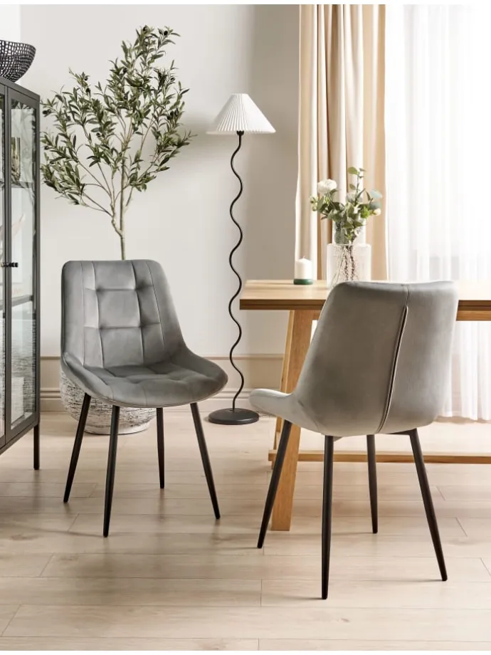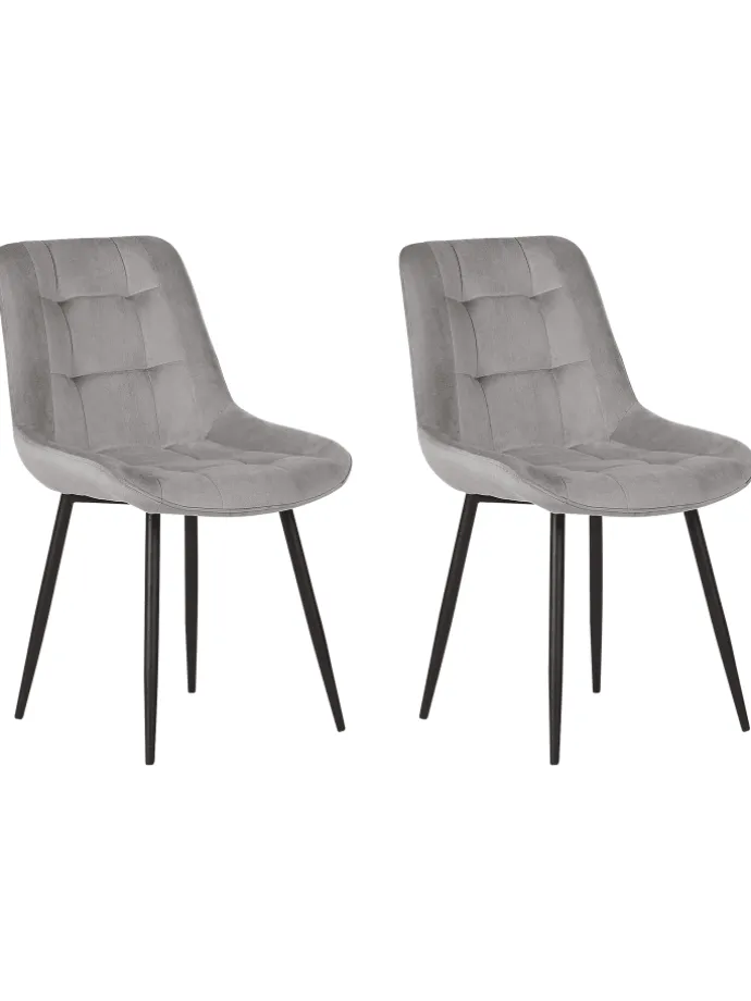 Moderne Stühle im 2er-Set aus Samt in zeitlosem Grau. Dieses bequeme Set ist für die gemeinsame Zeit beispielsweise beim Abendessen unerlässlich. Die Sitzschalen bestechen nicht nur mit ihrer schönen Form und Steppung, sondern auch mit ihrer weichen Polsterung, die optimalen Sitzkomfort verspricht. Der Bezug der Stühle besteht aus pflegeleichtem Samt und die schlanken schwarzen Metallfüße bieten Stabilität als auch Standfestigkeit.