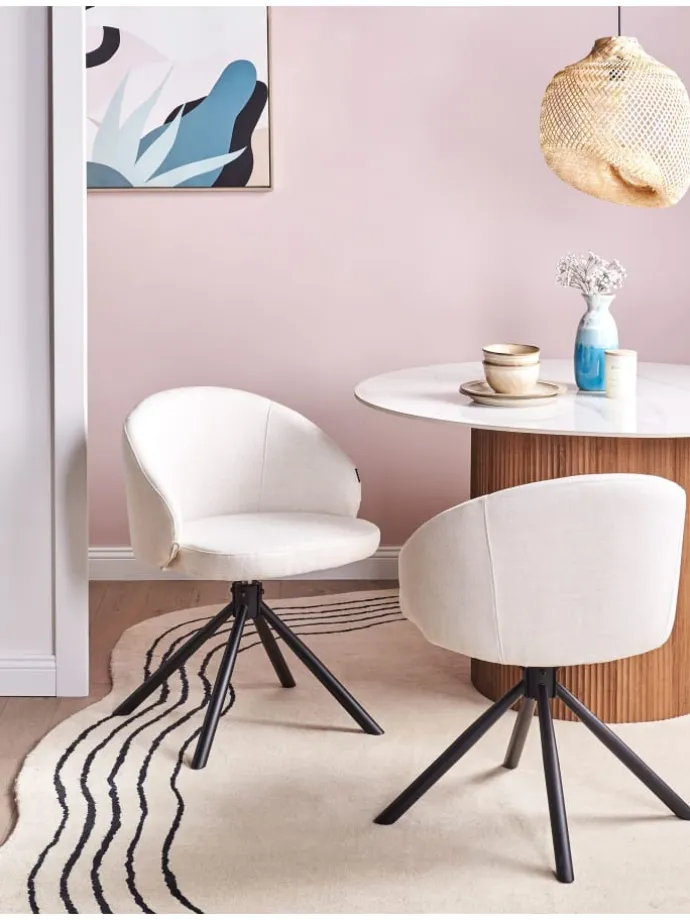 Drehstühle im Retro-Stil. Dieses 2er-Stuhl-Set ist die perfekte Ergänzung für jeden Esstisch und vereint retro-inspiriertes Design mit modernem Komfort. Die Stühle verfügen über eine angenehm geschwungene Rückenlehne und einen gepolsterten Sitz. Das stabile schwarze Metallgestell ermöglicht eine sanfte Drehbewegung und verleiht dem Design eine praktische Note, ohne an Stil einzubüßen. Ideal, um Ihren Essbereich mit einer gelungenen Mischung aus klassischem Charme und zeitgemäßer Funktionalität zu gestalten.