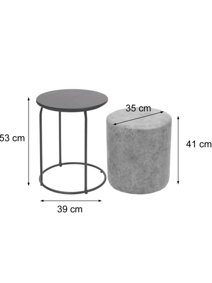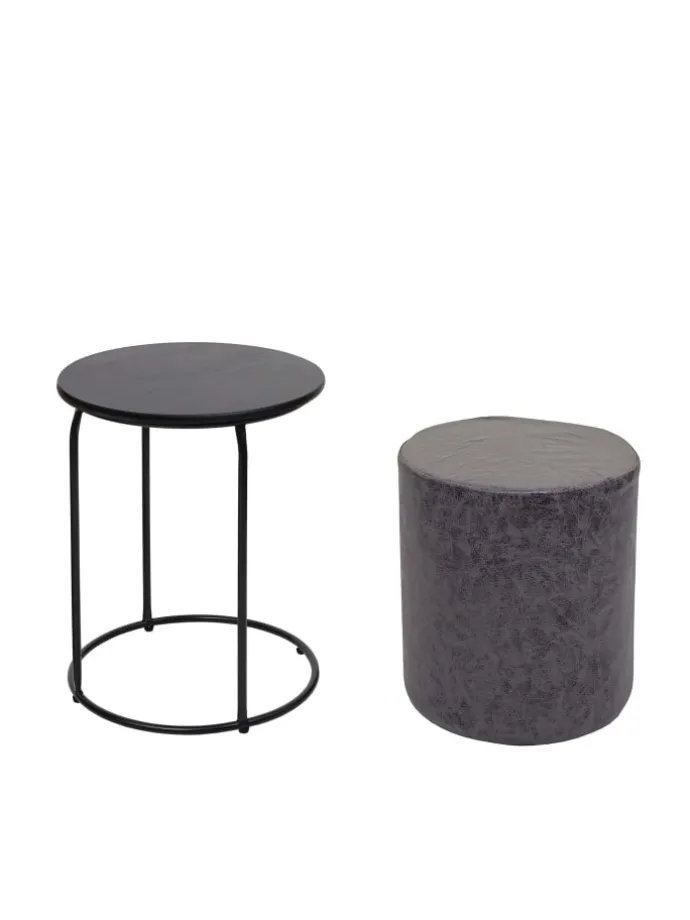 – Der Beistelltisch mit Eisengestell und MDF-Tischplatte bietet Platz für Getränke, Snacks oder Kleinigkeiten. Der Pouf mit pflegeleichtem Kunstleder ist eine bequeme Sitzmöglichkeit oder ein Fußhocker und kann platzsparend unter dem Tisch verstaut werden.