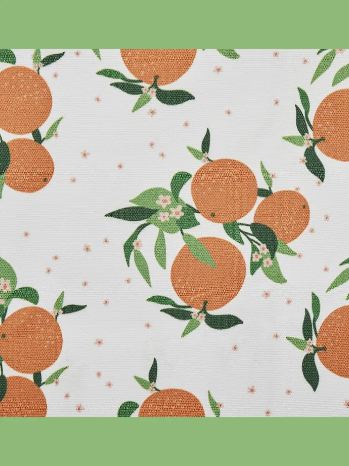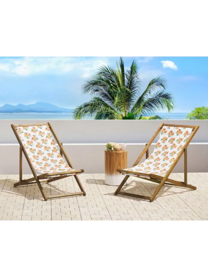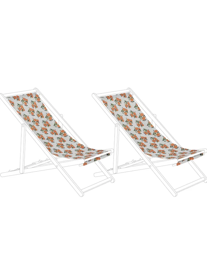 Zwei wechselbare Liegestuhl Bezüge mit Orangen-Motiv. Frischen Sie Ihre Liegestühle auf und genießen Sie das sommerliche Wetter auf einem Stoff der Extraklasse. Das hochwertige Gewebe ist besonders robust und stark, so kann es Ihr Körpergewicht entsprechend halten. Durch die UV-Beständigkeit und Pflegeleichtigkeit des Materials eignet es sich hervorragend für den Outdoor-Bereich. Die Montage gestaltet sich unglaublich einfach – es reicht die Querstangen Ihres Liegestuhl-Gestells zu entfernen und den Stoff anzubringen. Kombinieren Sie gleich mehrere verschiedenfarbige Stoffe aus unseren Sortiment, um sich ein besonders farbenfrohes Arrangement im Garten zu errichten.