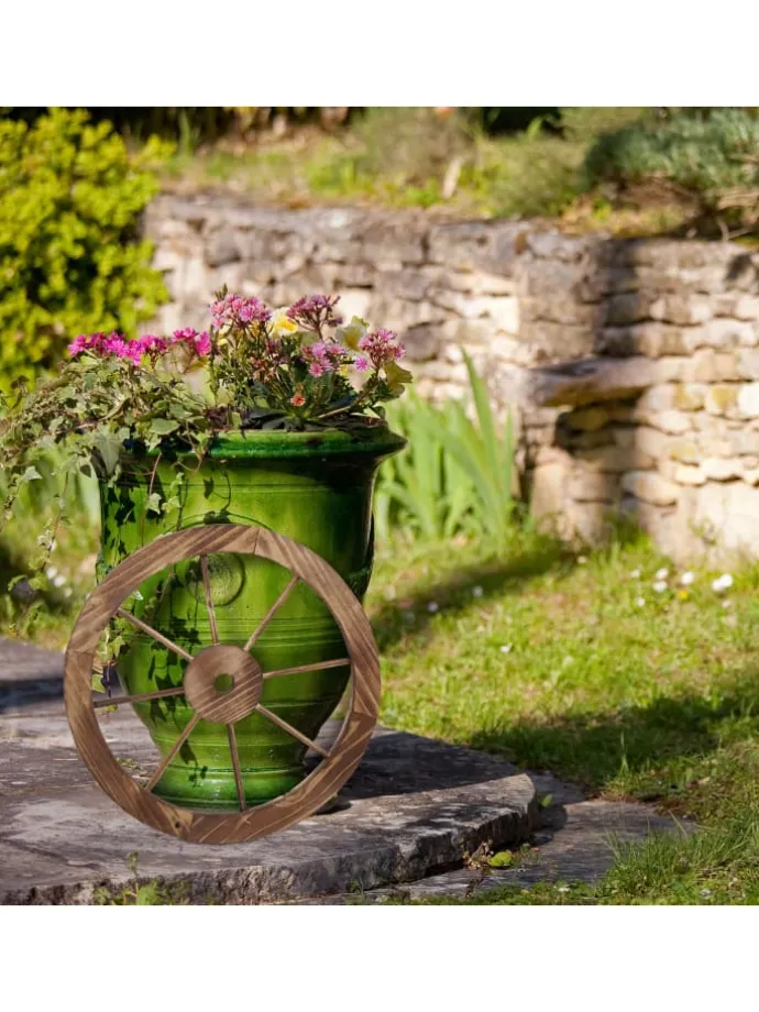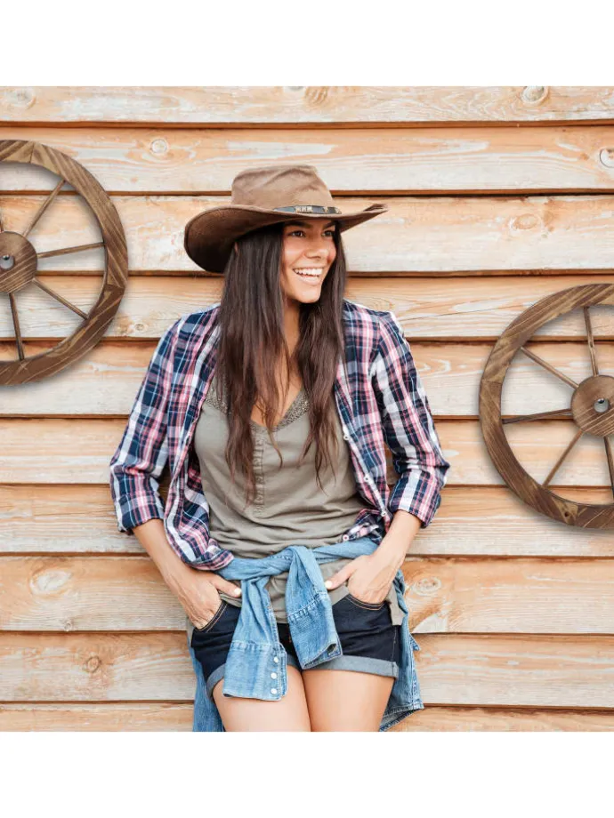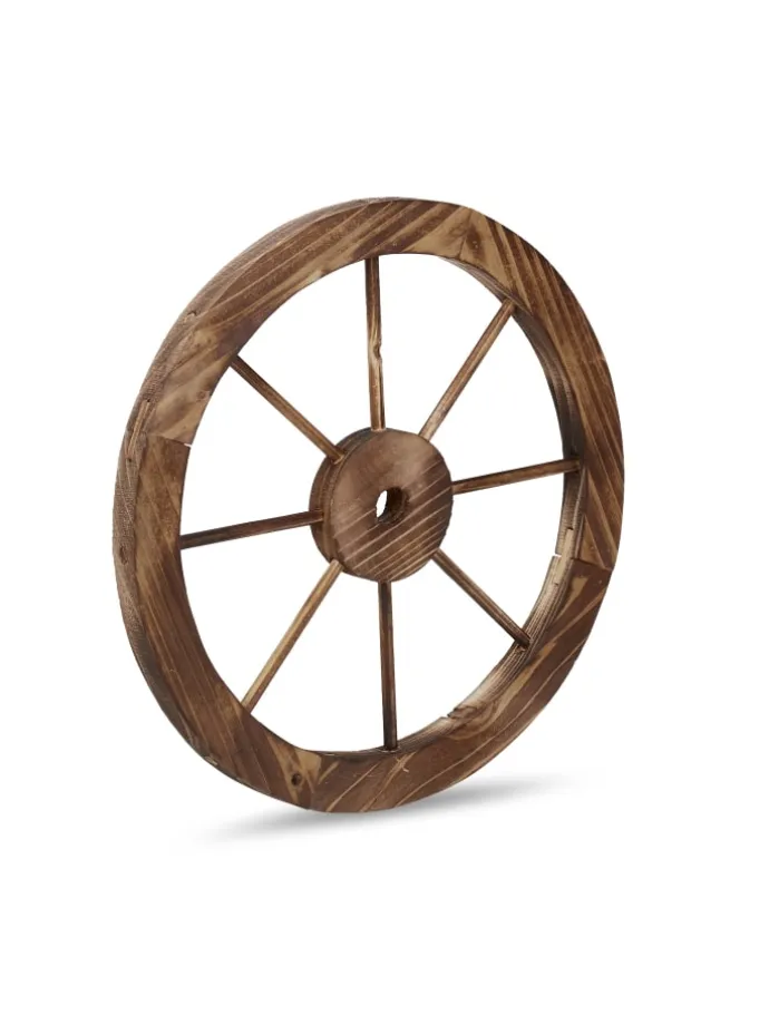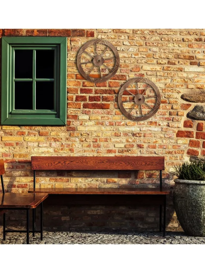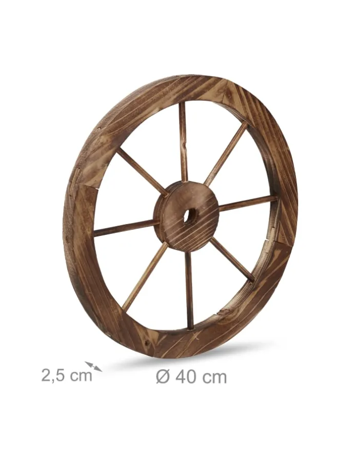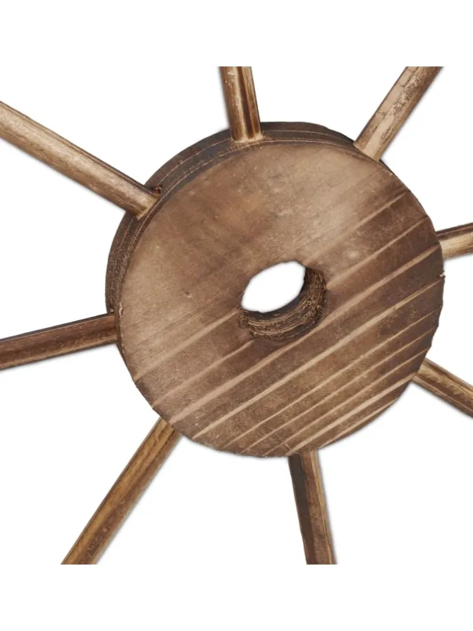 Peppen Sie mit diesem Wagenrad im 2er Set ihren Garten so richtig auf. Das Heuwagenwad kann einfach ins Beet gelegt, an den Zaun gehängt oder an der Wand befestigt werden und versprüht so ein uriges Flair. Für den rustikalen Look des Deko Holzrades sorgt die spezielle Flammung: Dank dieser tritt die natürliches Maserung des Materials besonders schön hervor. Das Kutschenrad ist vielseitig verwendbar und lässt auch in Läden oder auf Bühnen ein richtiges Western- und Country-Feeling aufkommen.