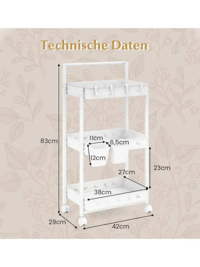 Machen Sie sich bereit, Ihre Organisation mit unserem dreistufigen Aufbewahrungswagen zu revolutionieren! Dieser elegante und stilvolle Wagen bietet auf 3 Ebenen reichlich Stauraum sowie 2 Hängebecher und 4 abnehmbare Haken für endlose Aufbewahrungsmöglichkeiten. Mit vier 360°-Rollen, von denen zwei feststellbar sind, gleitet dieser Wagen mühelos durch Ihr Zuhause und bietet gleichzeitig Stabilität dort, wo Sie sie am meisten brauchen. Darüber hinaus sorgt das ausgehöhlte Design des belüfteten Bodens für eine einfache Entwässerung und Belüftung. Egal, ob Sie Ihre Küche, Ihren Bastelraum, Ihre Garage oder Ihr Badezimmer aufräumen müssen, dieser robuste und schicke Wagen ist die perfekte Lösung für Ihren geschäftigen Lebensstil. Begrüßen Sie ein aufgeräumtes Zuhause!