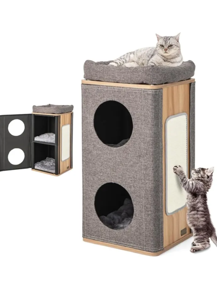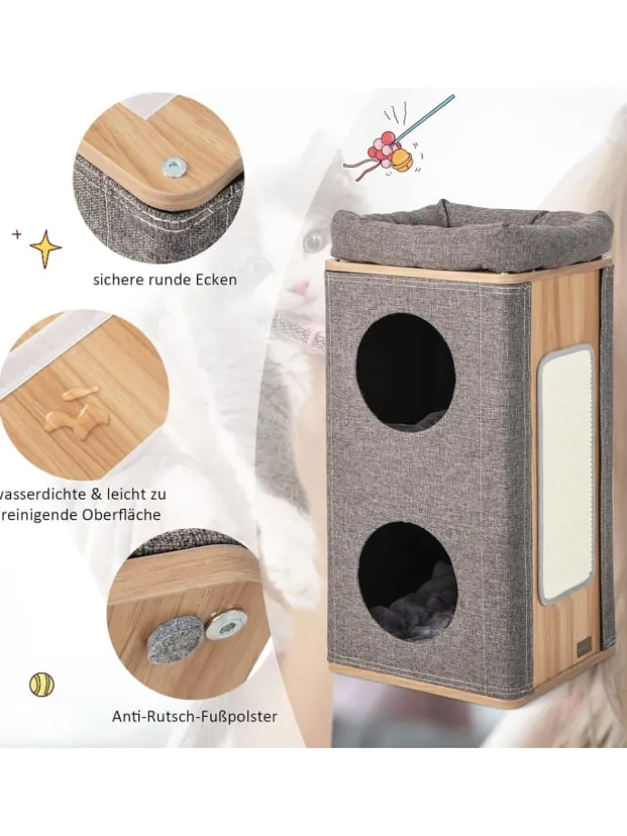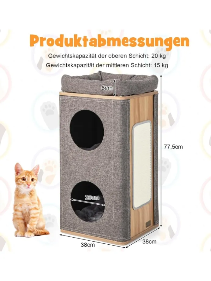 Ein großes Aktivitätscenter, das alle Bedürfnisse Ihrer Katzenfreunde erfüllt! Unser tonnenförmiges Katzenhaus ist dreistöckig und bietet Ihrem pelzigen Freund zwei Schichten gemütlicher Verstecke zum Entspannen, Schlafen und Faullenzen. Zudem befindet sich ein bequemes Kissen ganz oben, auf dem ihre Katze Sonnenbaden oder die Aussicht genießen kann. Außerdem ist im Lieferumfang ein Kratzbrett enthalten, an dem Katzen ihre Krallen schärfen können, wodurch auch verhindert werden kann, dass sie ihre Möbel zerkratzen.