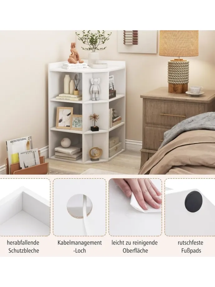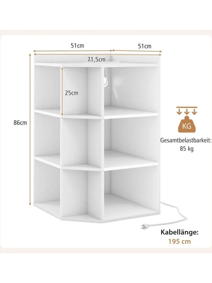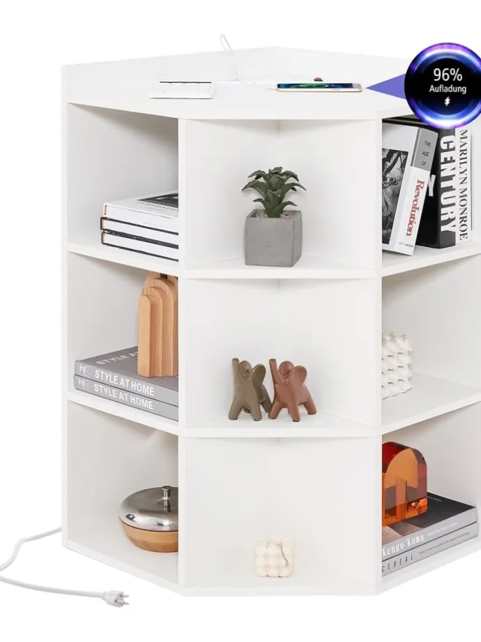 Unser Eckregal mit Ladestation hält nicht nur alles gut organisiert, sondern hilft Ihnen auch, Telefone und Laptops gleichzeitig aufzuladen. Die Ladestation verfügt über 4 Steckdosen und 2 USB-Anschlüsse, um verschiedene Geräte aufzuladen. 9 Fächer ermöglichen es Ihnen, viele Dinge zu verstauen. Darüber hinaus bietet die geräumige Oberseite zusätzlichen Stauraum. Das Eckregal kann in jeder Ecke Ihres Hauses platziert werden, sodass Sie den begrenzten Raum optimal nutzen können.