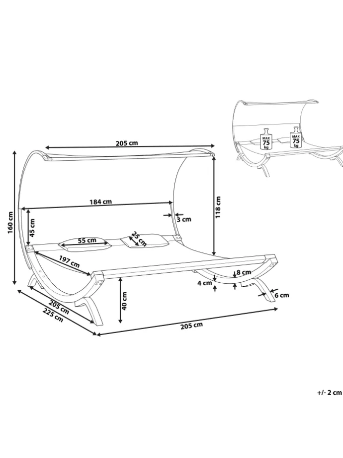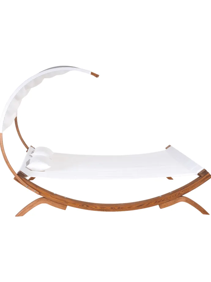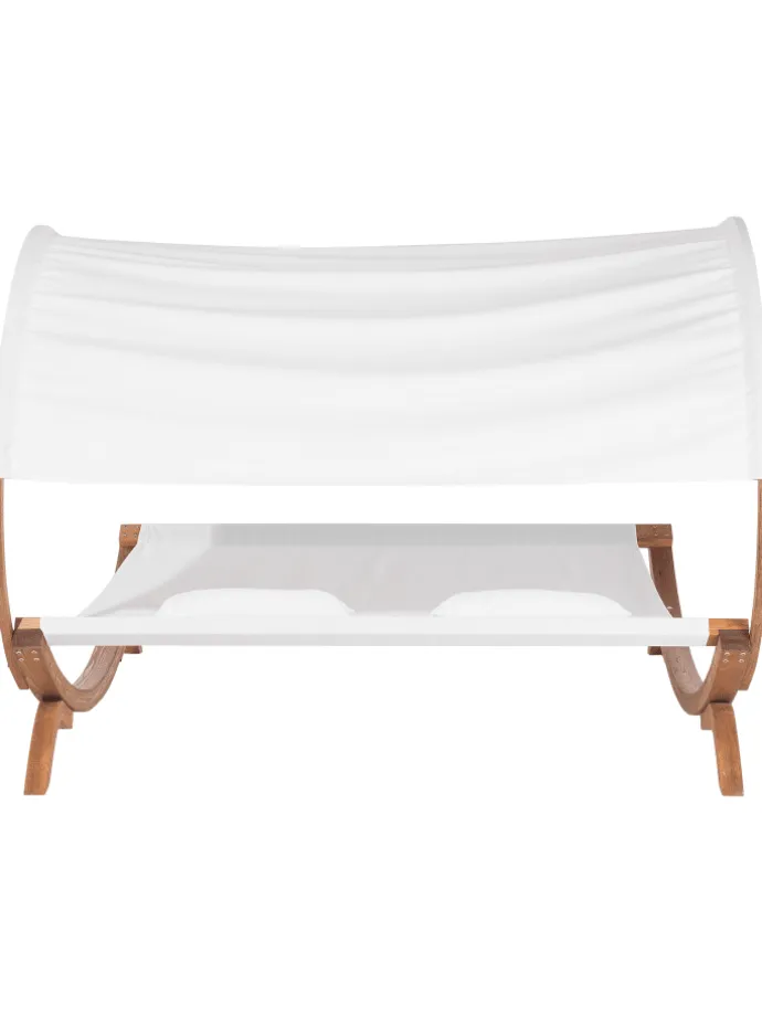 Traumhaft schöne Doppelliege aus Lärchenholz mit Sonnendach. Die robuste, strapazierfähige Bespannung der Sonnenliege verspricht optimalen Liegekomfort mit ausreichend Platz für 2 Personen. Das große Sonnendach schützt perfekt vor starker Sonneneinstrahlung. Das pflegeleichte Material aus beständigem Polyester passt mit seinem hellen, sommerlichen Cremeweiß ausgezeichnet zu dem stabilen Gestell aus hochwertigem Lärchenholz in einem warmen Teakholzfarbton. Mit ein paar Handgriffen kann das Gestell des Sonnendachs auseinander genommen werden. So können Sie das Sonnendach ganz leicht abnehmen und waschen.