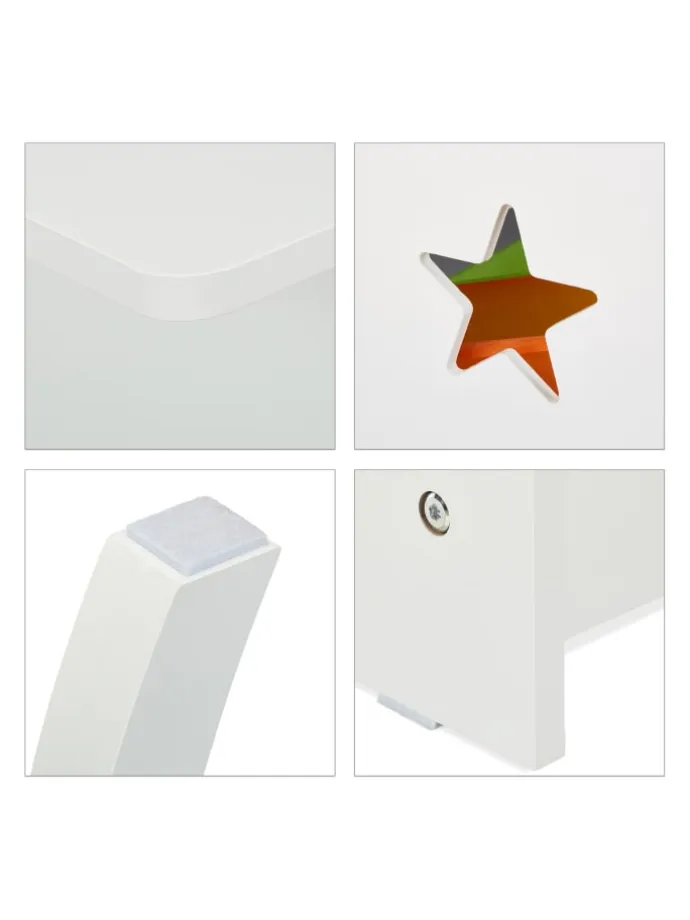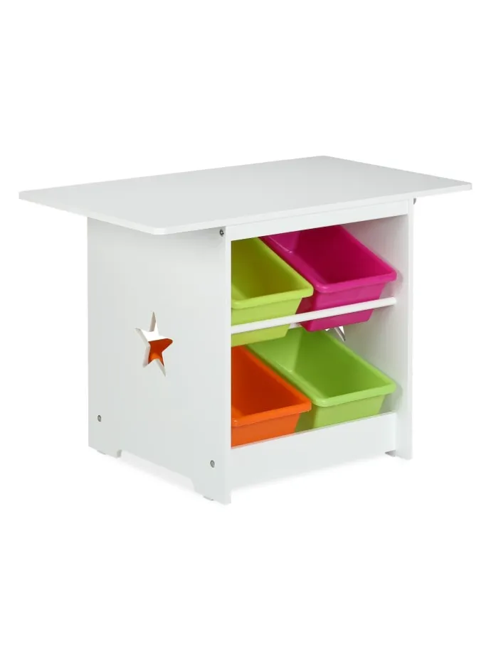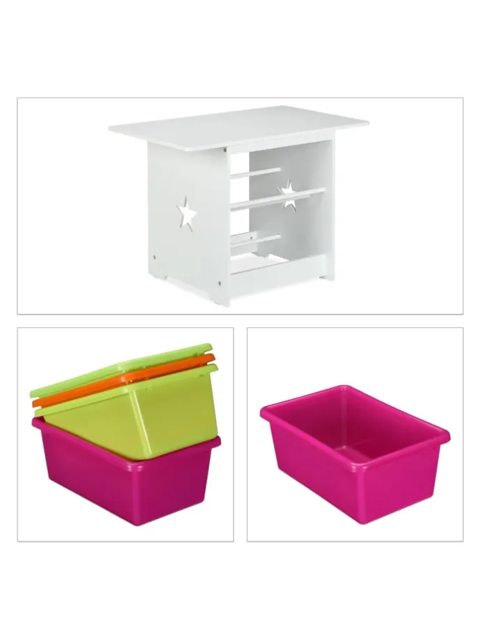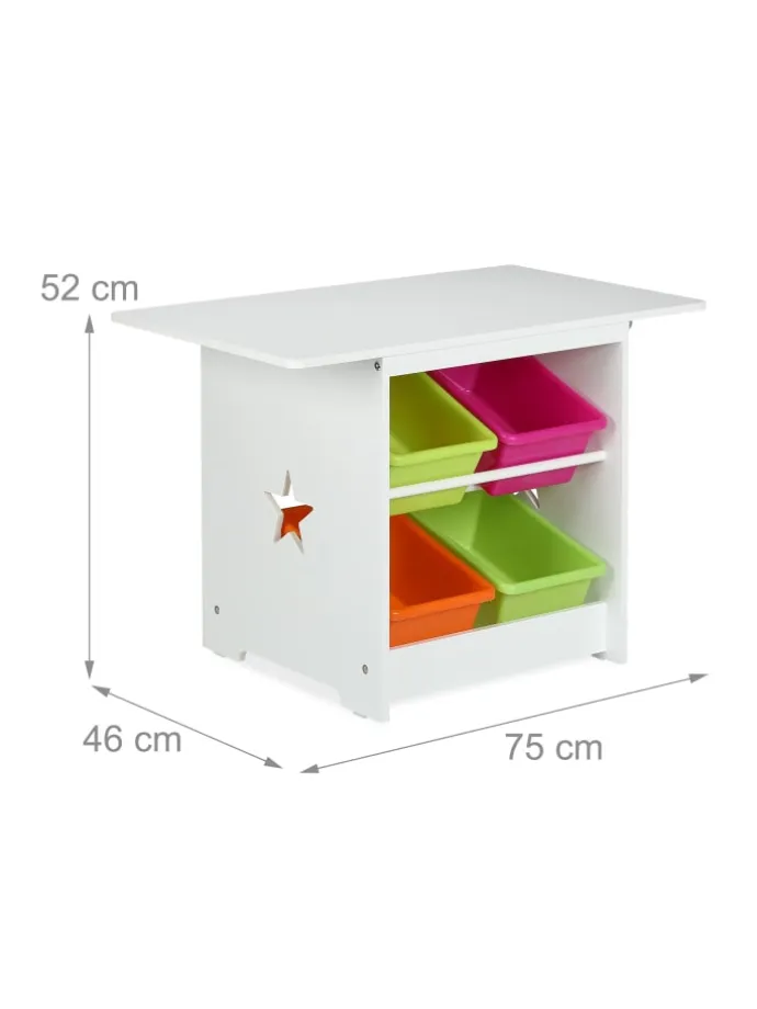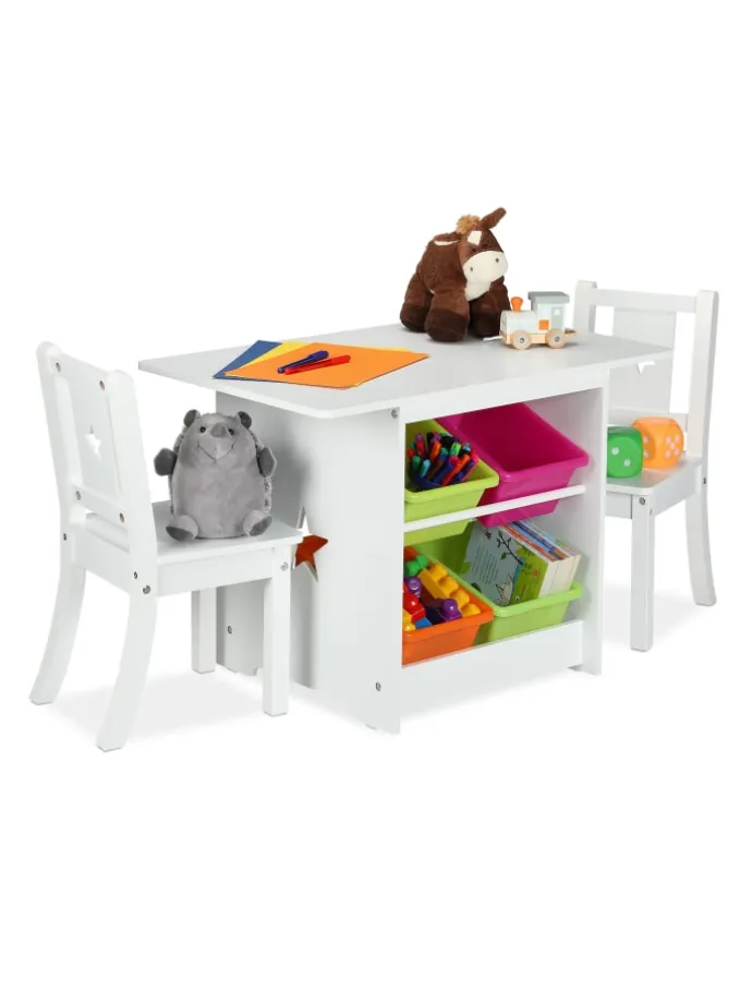 Die Kindersitzgruppe mit Sternen ist eine tolle Sitzgelegenheit für das Kinderzimmer. Das 3-teilige Set besteht aus einem Kindertisch und 2 Stühlen. Lass Deine Kleinen selbstständig an dem geräumigen Basteltisch malen, spielen oder essen. Dank der niedrigen Sitz- und Tischhöhe können 2 Kinder bequem auf der Kinder-Sitzgarnitur Platz nehmen und sich wie die Großen fühlen. Durch die 4 bunten Aufbewahrungskisten ist das Spielzeug gleich griffbereit und nach dem Spielen wieder ordentlich verstaut.