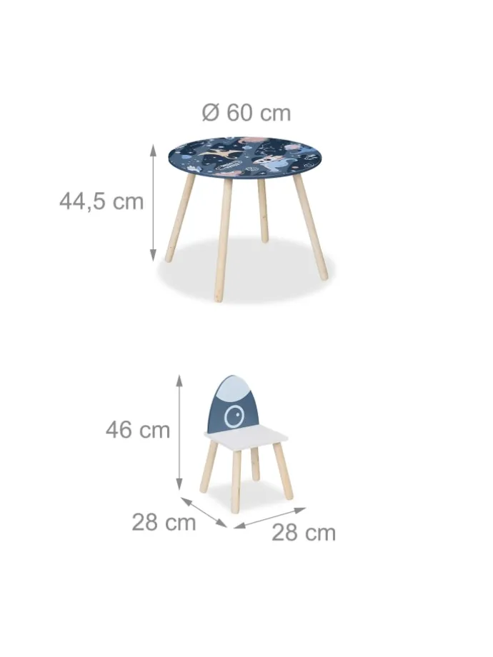 Diese Kindersitzgruppe ist eine tolle Sitzgelegenheit für das Kinderzimmer. Das 3-teilige Set besteht aus einem Kindertisch und 2 Stühlen. Lass Deine Kleinen selbstständig an dem Basteltisch malen, spielen oder essen. Dank der niedrigen Sitz- und Tischhöhe können 2 Kinder bequem auf der Kinder-Sitzgarnitur Platz nehmen und sich wie die Großen fühlen. Das Design mit bunten Prints begeistert kleine Dinofans und Weltraumforscher gleichermaßen. Die Holzbeine sorgen zugleich für einen sicheren Stand.