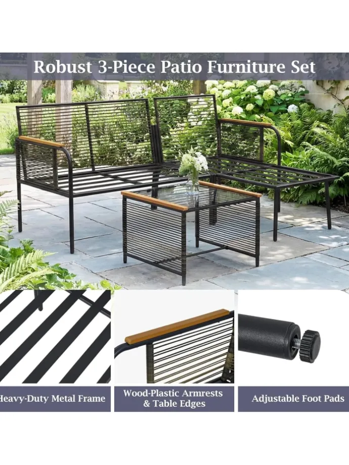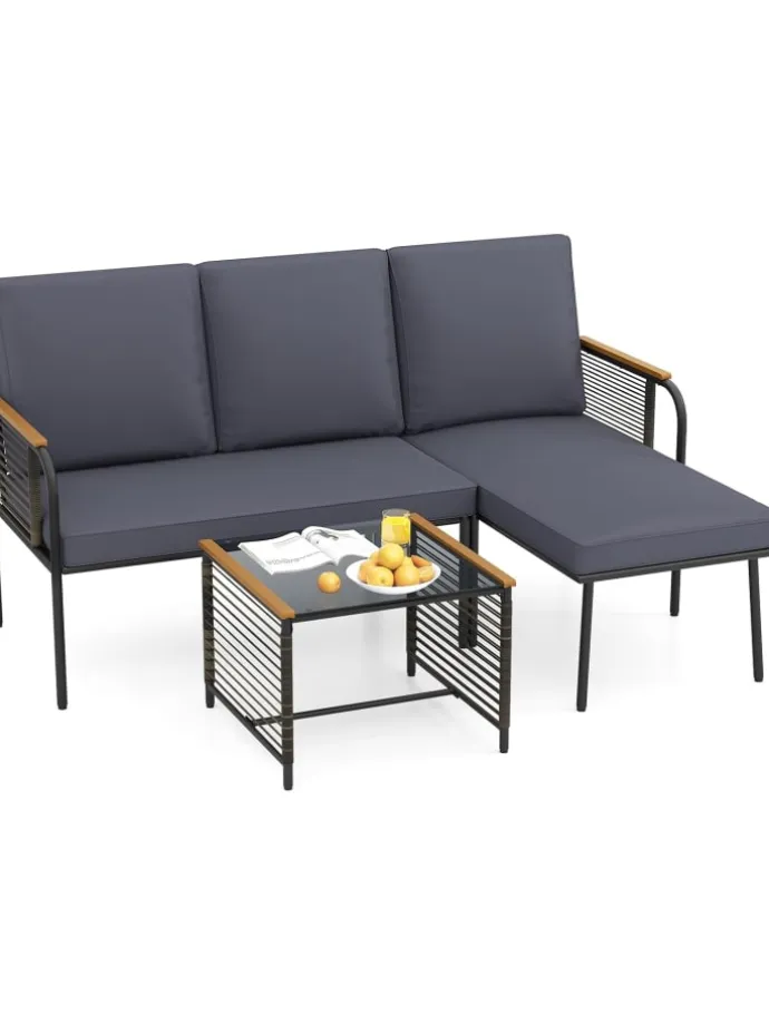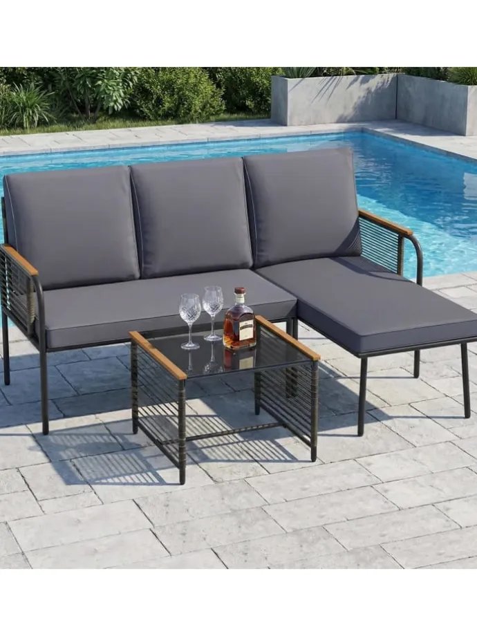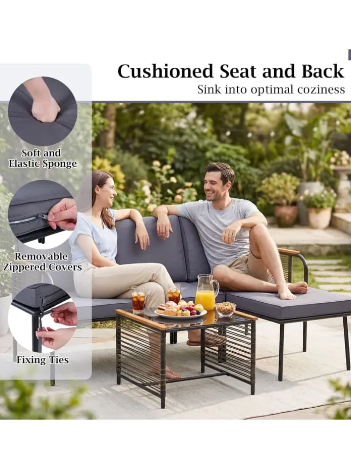 Verleihen Sie Ihrer Veranda oder Ihrem Garten mit diesem vielseitigen L-förmigen Lounge-Möbelset dauerhaften Charme und Komfort. Gefertigt aus sonnengeschütztem und atmungsaktivem PE-Rattan bieten das 2-Sitzer-Sofa und die Liege sowohl Eleganz als auch Langlebigkeit. Weiche, elastische Kissen mit abnehmbaren Bezügen sorgen für außergewöhnlichen Komfort und einfache Pflege. Der Sicherheitsglas-Beistelltisch bereichert die Funktionalität, stabilisiert durch Saugnäpfe.