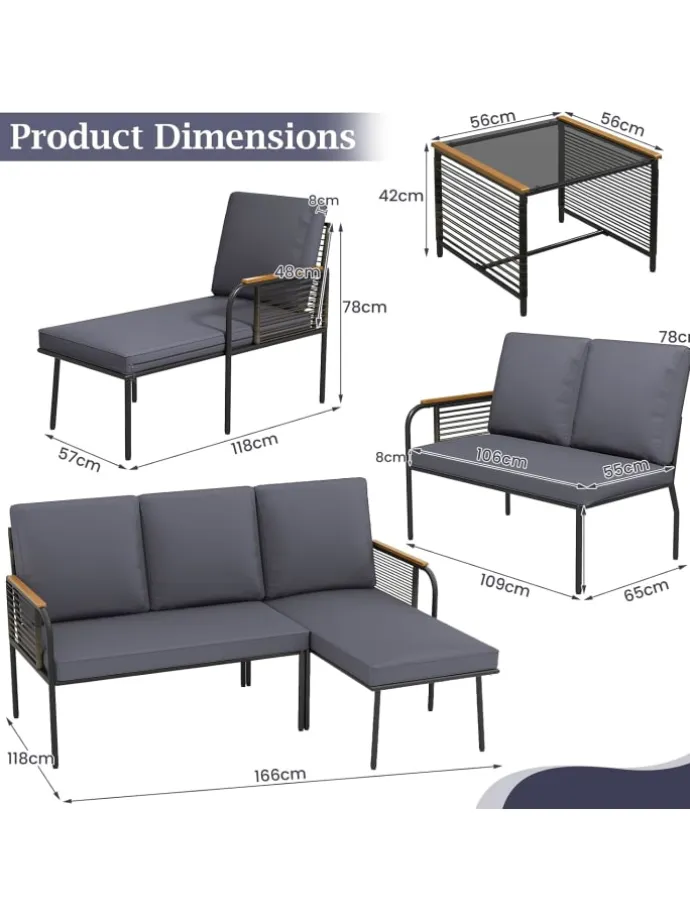 Materialien: PE-Rattan, Metall, Polyester, Schaumstoff, Sicherheitsglas, Holz-Kunststoff