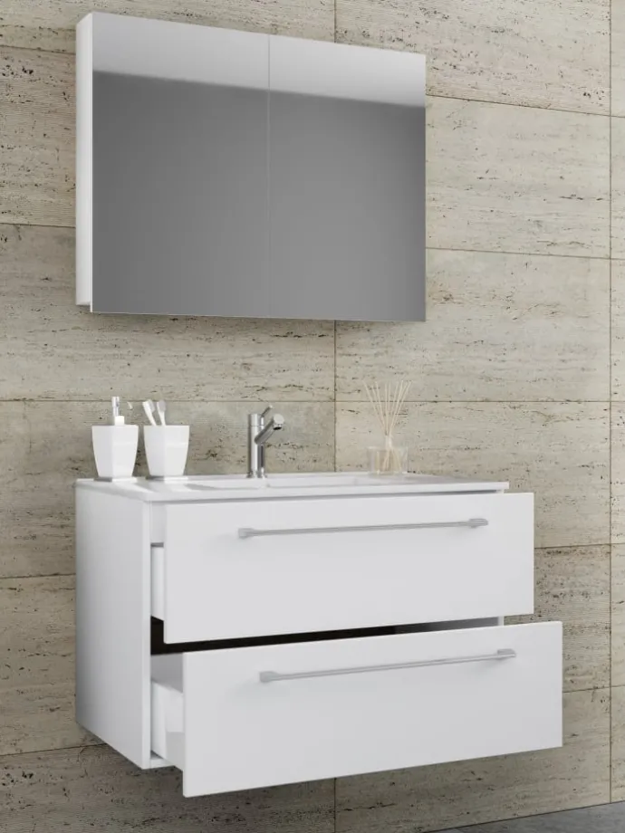 Das Badmöbel-Set besteht aus einem Unterschrank mit zwei Schubladen auf robusten Metallschienen.