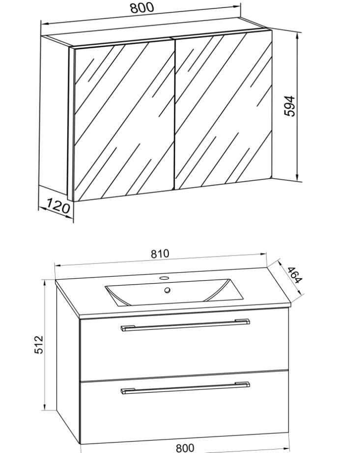 – Maße Waschtisch H. 52 x B. 80 x T. 46 cm, Maße Spiegelschrank H. 59 x B. 80 x T. 12 cm