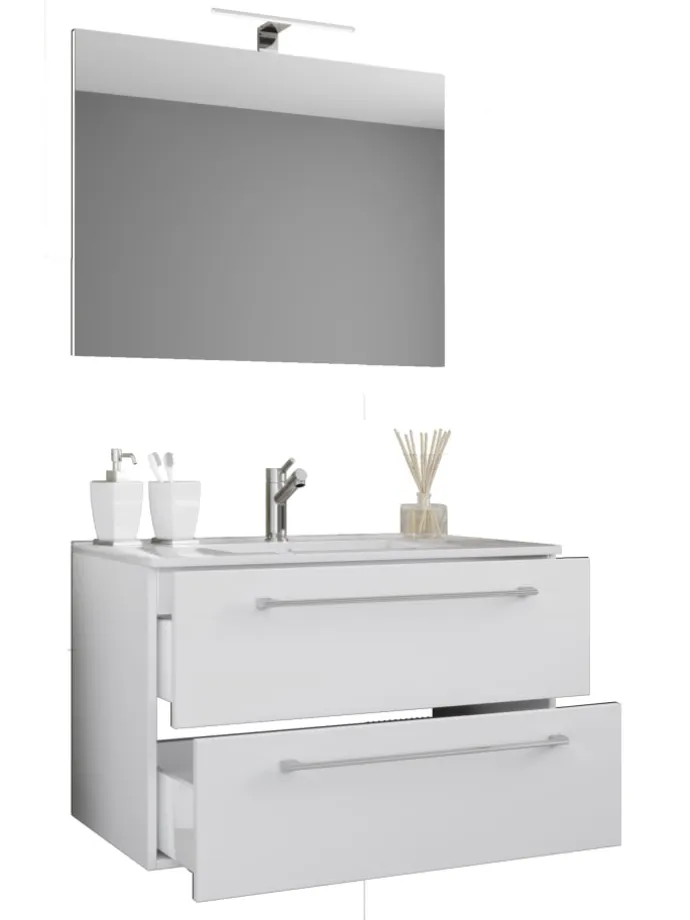 Ein modernes Waschbecken aus massiver Keramik und einem Spiegel strapazierfähigem Glas runden das Möbel ab, um den perfekten Blickfang im Badezimmer zu erhalten.
