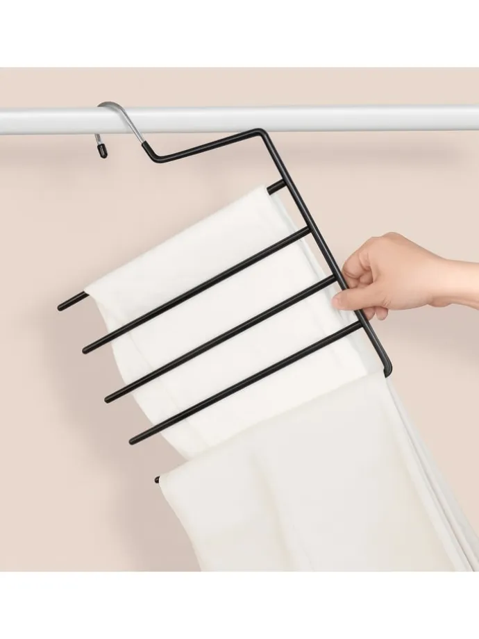 Wenn in Deinem Kleiderschrank der Platz ausgeht, sind diese Mehrfachhosenbügel die richtige Wahl. Auf den Kleiderbügeln können bis zu 5 Hosen oder auch Schals platzsparend untereinander aufbewahrt werden, sodass der Stauraum im Schrank optimal genutzt wird. Die Hosenhalter sind zudem mit einer rutschfesten Gummierung versehen, sodass die Kleidung nicht herunterfällt. Dank des offenen Endes können Kleidungsstücke problemlos auf- und wieder abgehängt werden.