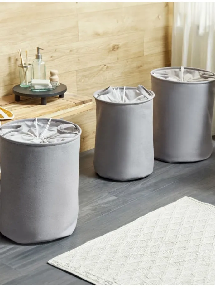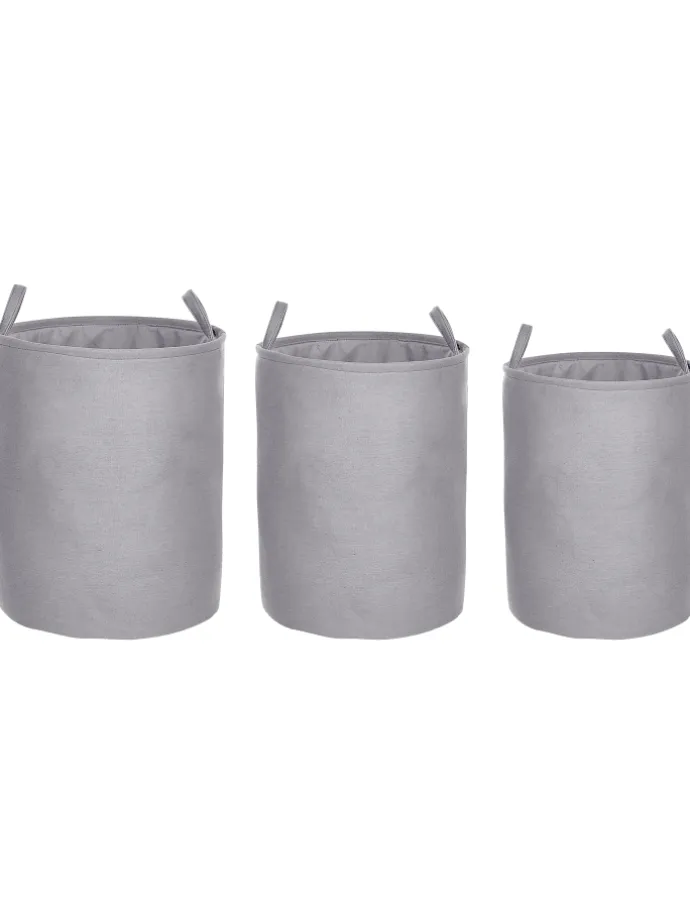 Runde, handgefertigte Wäschekörbe mit Kordelzügen und praktischen Tragegriffen. Diese vielseitigen Aufbewahrungskörbe sind die perfekte Lösung, um in Ihren Wohnräumen für Ordnung und Sauberkeit zu sorgen. Die Wäschesammler bestehen auch hochwertigen Stoffen, was sie sowohl funktionell als auch pflegeleicht macht. Die Körbe können dank des praktischen Kordelzugs leicht verschlossen werden, so sind die Modelle geruchsneutral. Dabei können Sie das Set für Ihre Wäsche, das Spielzeug Ihrer Kleinen oder viele andere Dinge, die nicht gebraucht werden, nutzen und all diese Sachen ganz einfach in den Körben blickdicht verstecken.
