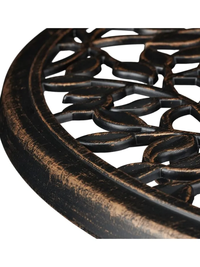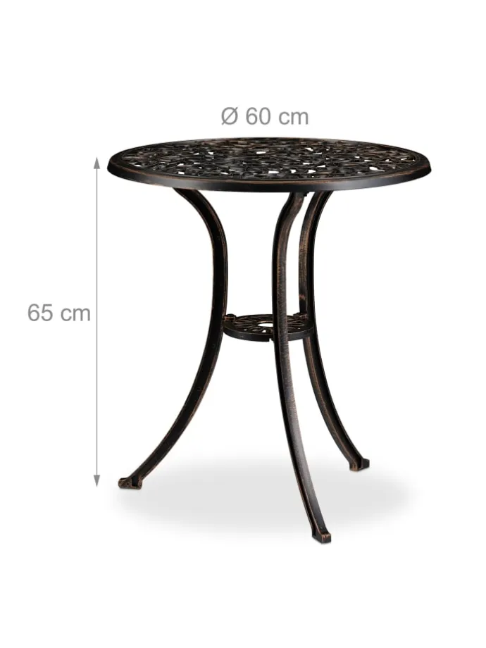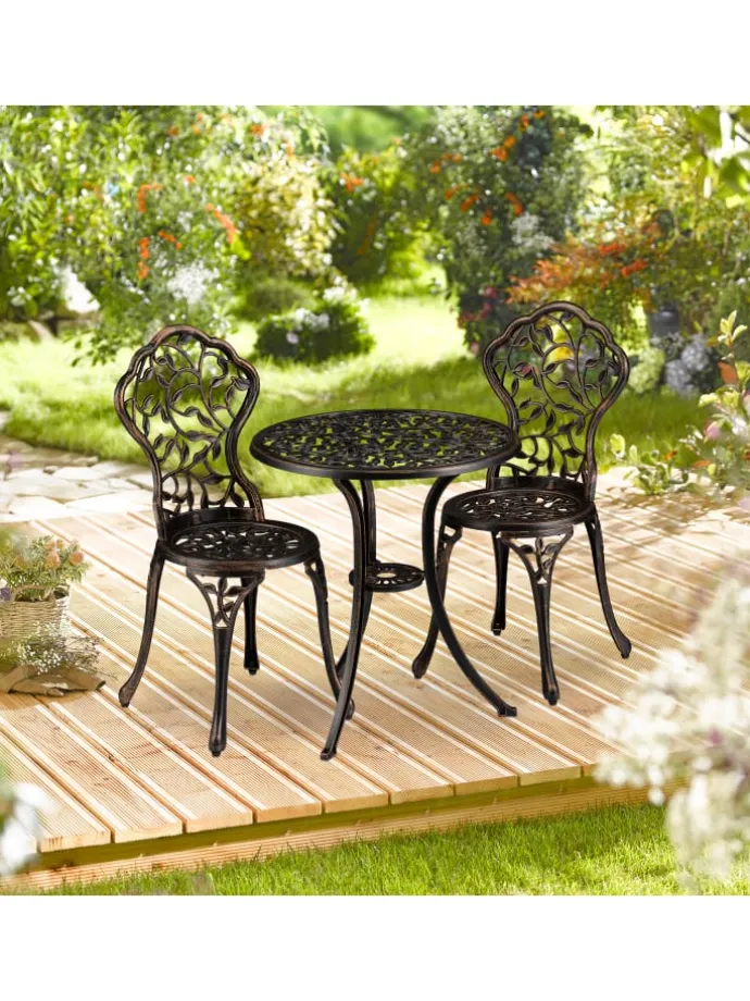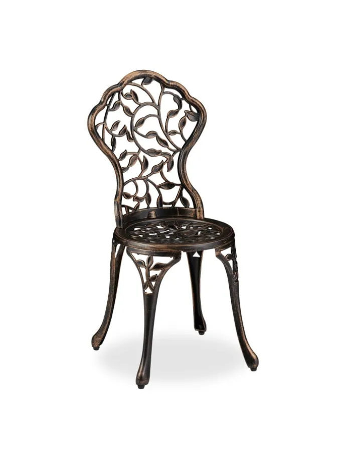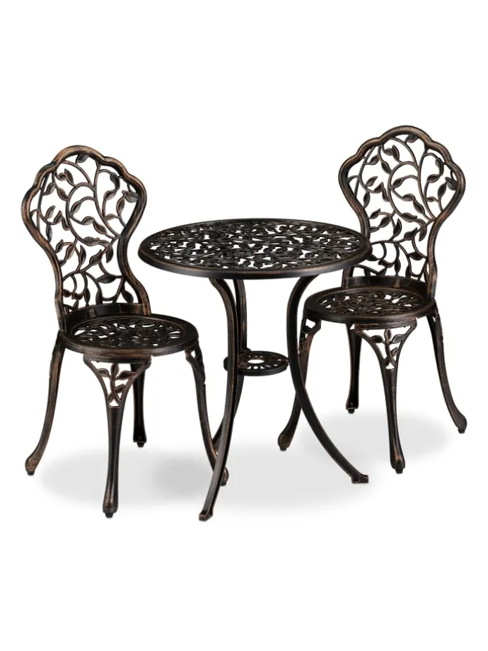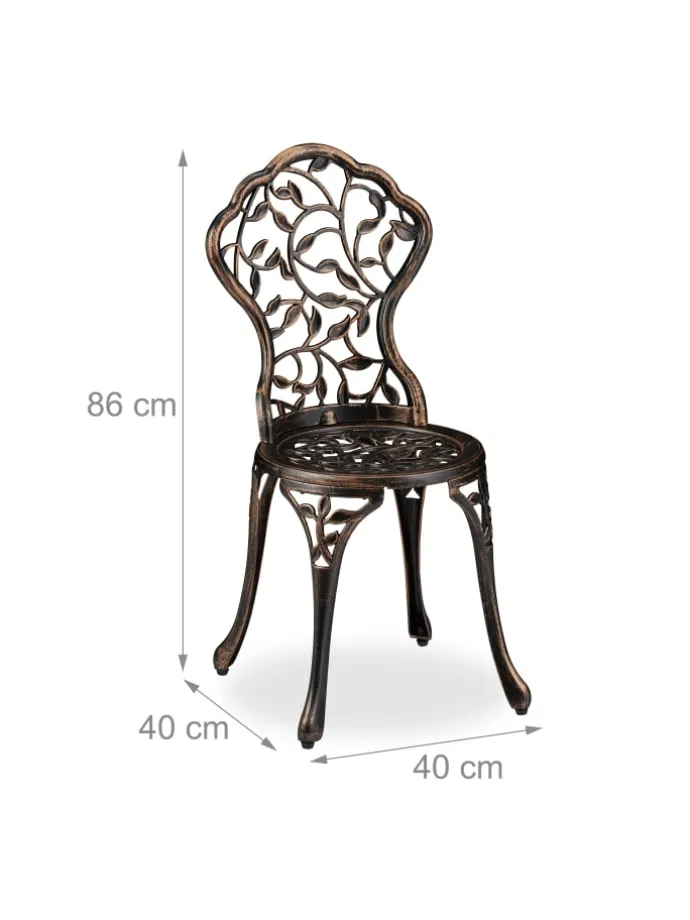 Träumen Sie sich in die französische Provence mit dem verspielten Bistro Balkonset im romantischen Design. Der runde Gartentisch und die 2 Stühle bestechen durch ihr florales Muster im bronzenen Farbton. Die Terrassenmöbel aus beschichtetem Aluminium sind leicht und doch robust. Die hohe Traglast zeichnet die Balkongarnitur ebenso aus wie ihre Witterungsbeständigkeit. Durch ihre Größe passen Balkonstühle und -tisch sowohl auf den kleinen Balkon als auch in den weitläufigen Garten.