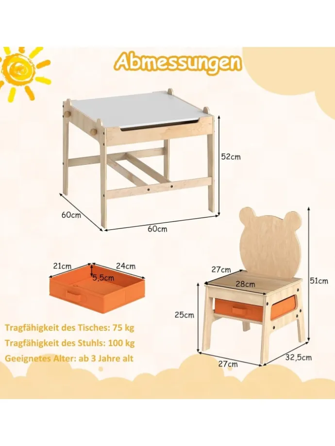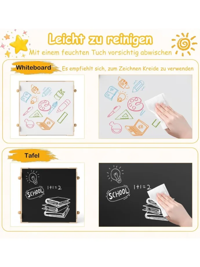 Entdecken Sie mit unserem vielseitigen Kindertisch mit 2 Stühlen eine Welt voller Kreativität und Spaß. Die wendbare Tischplatte ermöglicht einen Wechsel zwischen glatter Whiteboard und Kreidetafel. Unter dem Maltisch befindet sich ein großes, verstecktes Aufbewahrungsfach für Spielzeug, Bastelutensilien und Bücher, das den Spielbereich ordentlich hält. Zusätzlich bieten 2 herausnehmbare und faltbare Stoffschubladen zusätzlichen Stauraum. 2 massive Holzstäbe im Spieltisch dienen als Papierrollenhalter und praktische Haken.