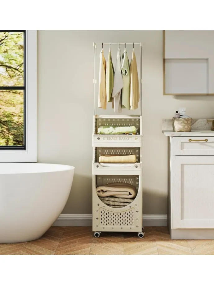 Dieser 2-in-1 Wäschewagen kombiniert eine Kleiderstange zum Lüften, einen geräumigen Wäschesack und einen Korb für Kleidung, Socken oder Decken sowie ein oberes Ablagefach für Waschmittel. Zusätzlich bieten 8 Haken einfachen Halt für Handtücher oder Bürsten. Die werkzeugfreie Montage ermöglicht schnelles Auf- und Zusammenklappen für eine kompakte Lagerung. Mit 4 Universalrollen (2 feststellbar) lässt sich der Wagen mühelos von Raum zu Raum schieben und sicher positionieren. Erhöhte Kanten und das ventilierte Design halten Ihre Wäsche sicher und frisch. Machen Sie den Wäschetag einfacher mit diesem vielseitigen 2-in-1 Wagen!