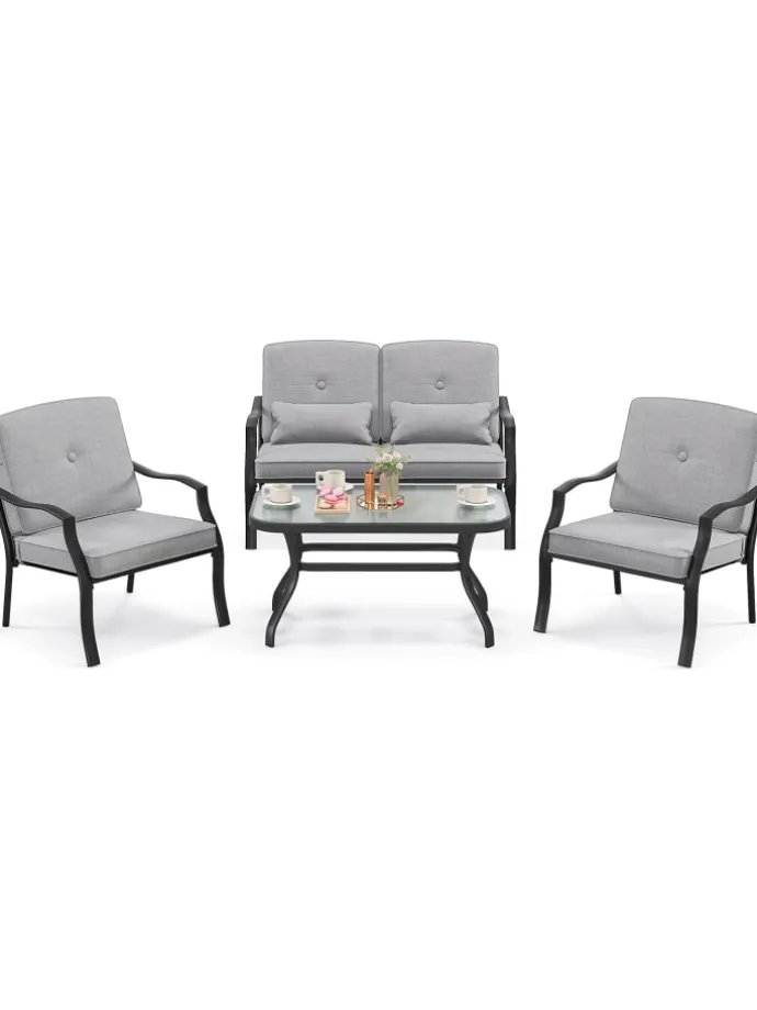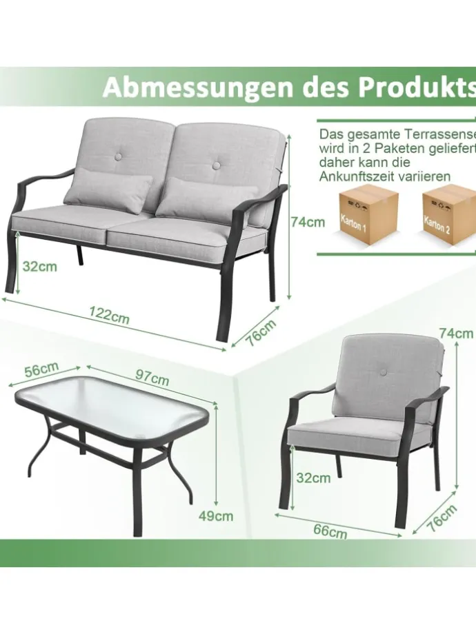 Ob Sie eine Versammlung veranstalten oder einfach nur etwas Outdoor-Entspannung genießen, dieses Set ist die perfekte Ergänzung für jeden Anlass. Mit Sitz- und Rückenkissen bieten sowohl die Einzelsofas als auch das Doppelsitzer-Sofa unübertroffenen Komfort. Dieses Set ist nicht nur bequem, sondern auch unglaublich stabil. Dank seines verstärkten Metallrahmens kann jedes Stück schweres Gewicht tragen, ohne seine Integrität zu beeinträchtigen. Darüber hinaus fügt die Tischplatte aus Sicherheitsglas eine Note von Eleganz hinzu und ist leicht zu pflegen. Das Set selbst besticht durch eine einfache, aber elegante Ästhetik und ergänzt mühelos verschiedene Außenbereiche wie Ihren Poolbereich oder Garten.