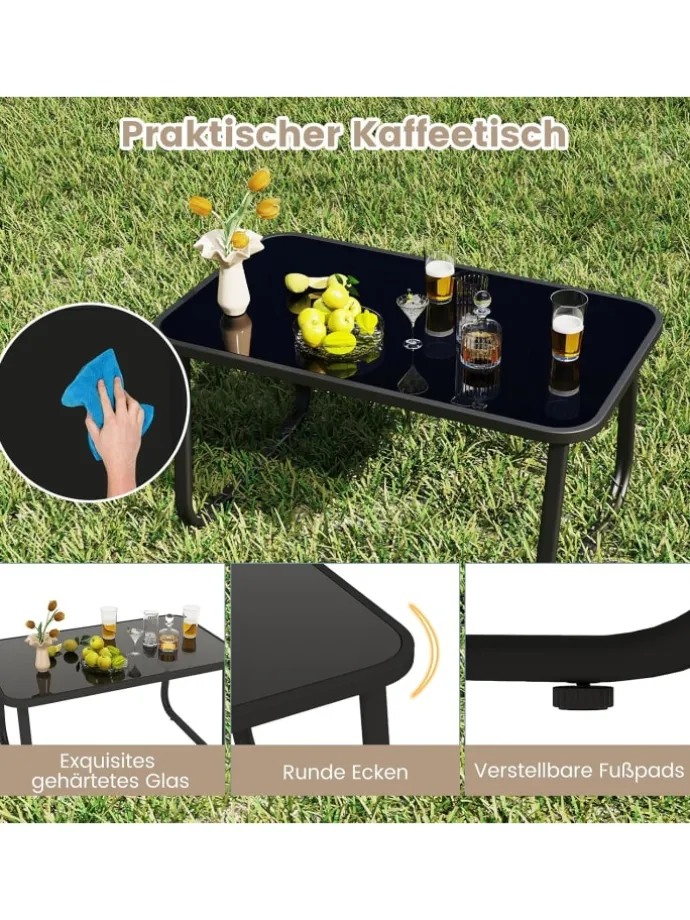 Dank der stabilen Basis mit rutschfesten Gummimatten und verstellbaren Stoppern sorgt jeder Stuhl für eine sanfte Schaukelbewegung. Und auch der ergonomische Sitz bietet Ihnen ultimativen Komfort. Der Sitzstoff wurde verbessert, um sowohl Komfort als auch Haltbarkeit zu gewährleisten und gleichzeitig atmungsaktiv und schnell trocknend zu sein. Und die elegante Tischplatte aus gehärtetem Glas des Gartentisches verleiht einen Hauch von Raffinesse und wird durch 4 Saugnäpfe fest fixiert. Ob in Ihrem Garten, am Pool oder auf Ihrem Balkon, dieses Set verspricht eine sichere und robuste Option zum Entspannen im Freien.