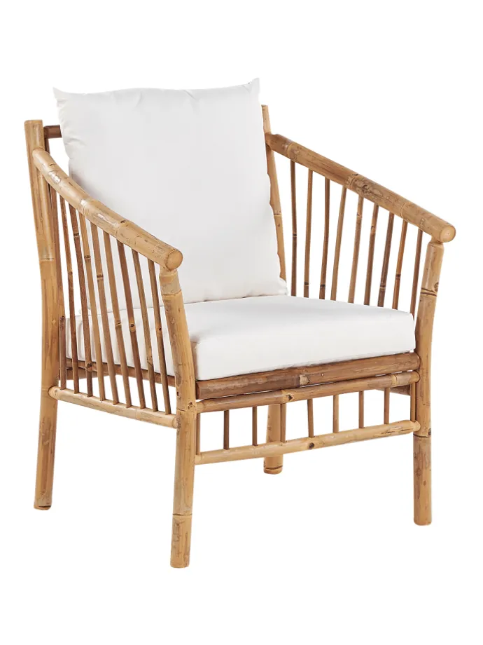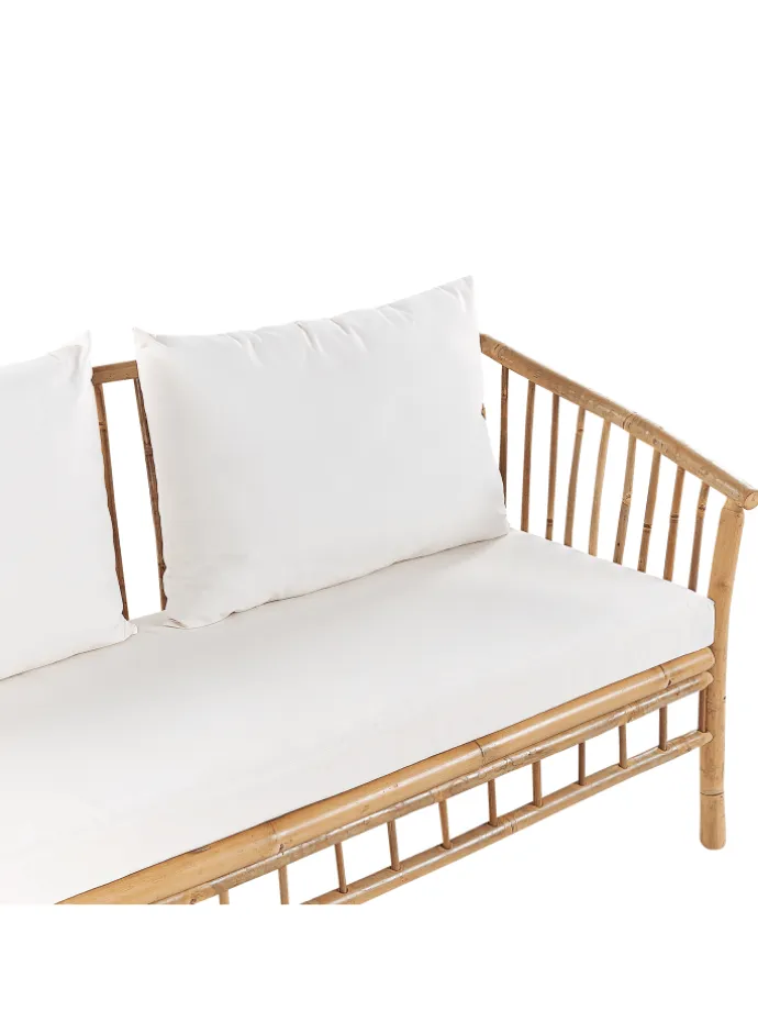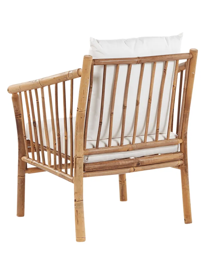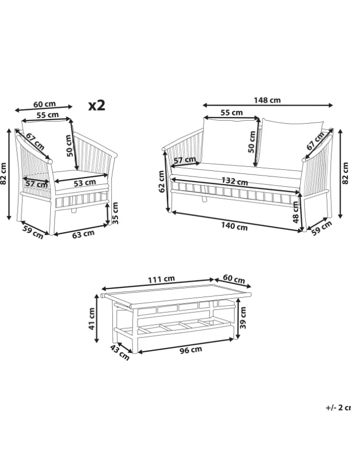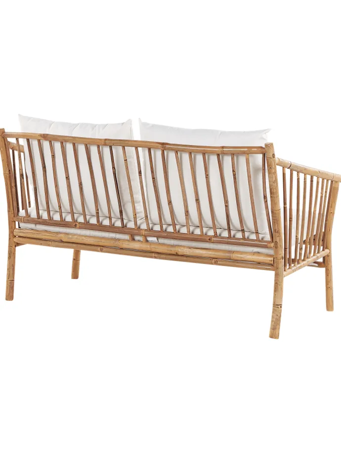 Moderne Gartenbank aus Bambusholz mit 2 Sesseln, Couchtisch und passenden Auflagen. Verwandeln Sie Ihren Garten in einen Ort der Entspannung mit diesem Outdoor-Set. Es besteht aus einem Sesseln, einem Sofa und einem Couchtisch, hergestellt aus langlebigem und hochwertigem Bambusholz. Außerdem sind alle Sitzflächen mit Polyesterkissen ausgestattet, damit das Sitzen angenehm und entspannend ist. Aufgrund der verwendeten Materialien passt das Set am besten in einen Raum mit rustikalem Stil.