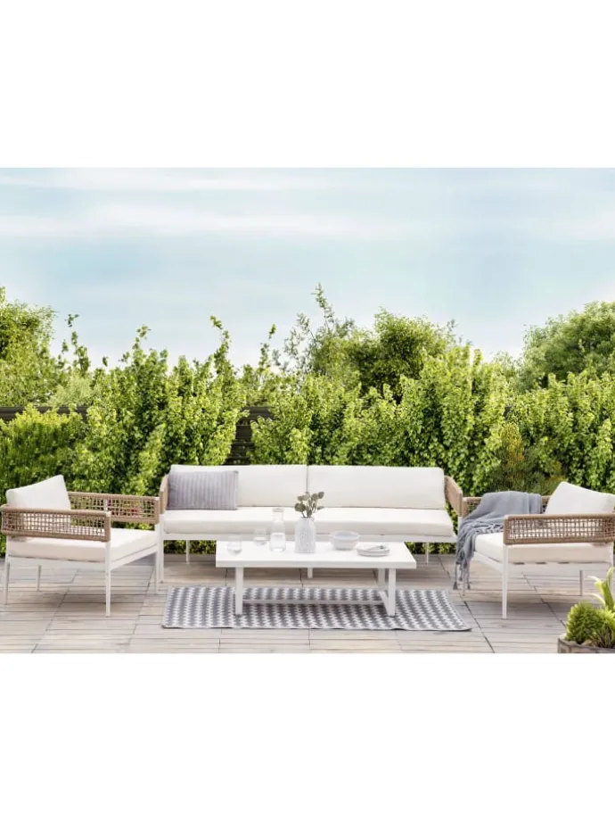 Stilvolles Garten-Set. Diese robuste und dennoch leichte Aluminium-Lounge ist die perfekte Wahl für jeden Garten oder jede Terrasse. Es besteht aus einem eleganten Sofa, zwei bequemen Sesseln und einem stilvollen Couchtisch, alle in Weiß. Jedes Sitzmöbel hat ein dekoratives Seilgeflecht an der Rückenlehne. Die weichen Kissen sind in passendem Weiß gehalten und haben abnehmbare Bezüge für eine einfache Reinigung und Pflege. Die Möbel sind UV-, rost- und lichtbeständig und somit sehr langlebig. Das Set sieht sowohl in traditionellen als auch in modernen Außenbereichen gut aus.