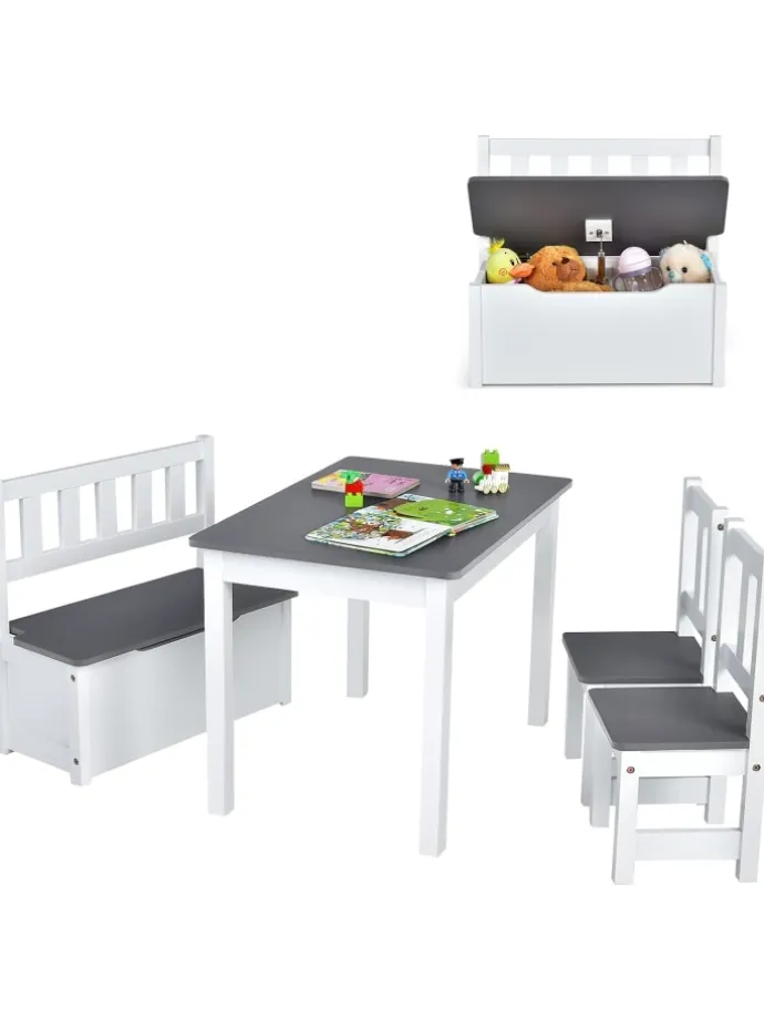 Es umfasst einen Tisch, eine Aufbewahrungsbank und 2 Stühle. Alle Teile bestehen aus hochwertigem MDF und Kiefernholz, sodass eine hohe Robustheit und Stabilität gegeben sind. Diese hochwertigen Materialien sind sehr sicher. Außerdem ist die Bank mit dem versteckten Staufach sehr praktisch. Die Griffe liegen gut in der Hand. Dieses Set ist wirklich eine perfekte Wahl für Kinder. Diese können daran malen, Hausaufgaben machen, essen, etc.