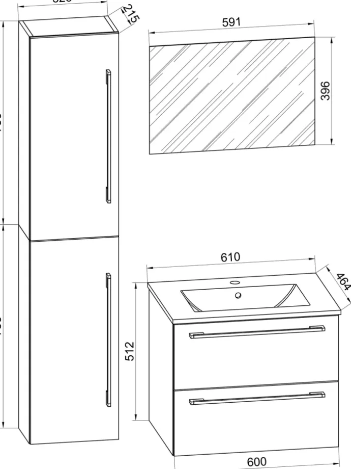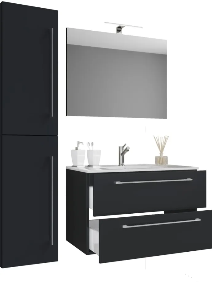– Set: 1 Unterschrank, 1 Waschbecken, 1 Spiegel, 1 Hochschrank