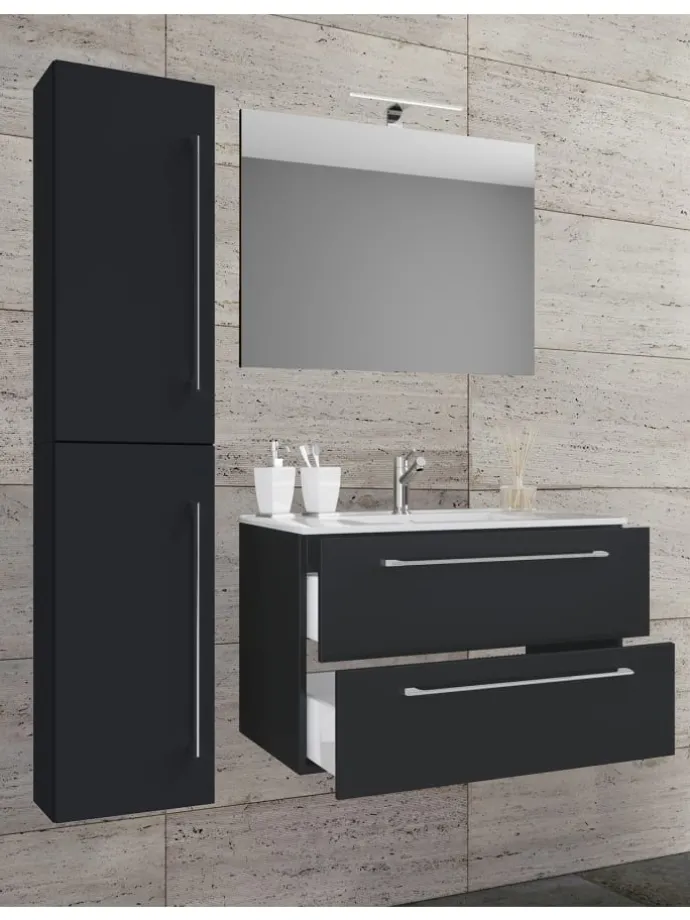 Das Badmöbel-Set „Badinos“ besteht aus einem Unterschrank mit zwei Schubladen auf robusten Metallschienen, einem Hochschrank und einem Spiegel aus ESG-Sicherheitsglas. Das moderne Waschbecken aus massiver Keramik dient als Blickfang und verleiht Ihrem Badezimmer ein ganz besonderes Ambiente.