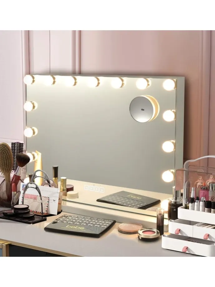 Erzielen Sie Make-up-Ergebnisse auf professionellem Niveau mit unserem Kosmetikspiegel mit dreifarbiger Beleuchtung. Darüber hinaus verfügt er über zwei kabellose Lautsprecher und einen USB-Ladeanschluss, was ihn sowohl für Unterhaltung als auch zum Aufladen Ihrer Geräte praktisch macht. Je nach Bedarf können Sie mit der Touchsteuerung die Beleuchtung und Lautstärke mühelos durch einfaches Berühren des Bildschirms anpassen. Der Spiegel verfügt außerdem über eine tragbare Lupe zum präzisen Auftragen und Ausbessern von Make-up und bietet zwei Montageoptionen für eine vielseitige Platzierung.