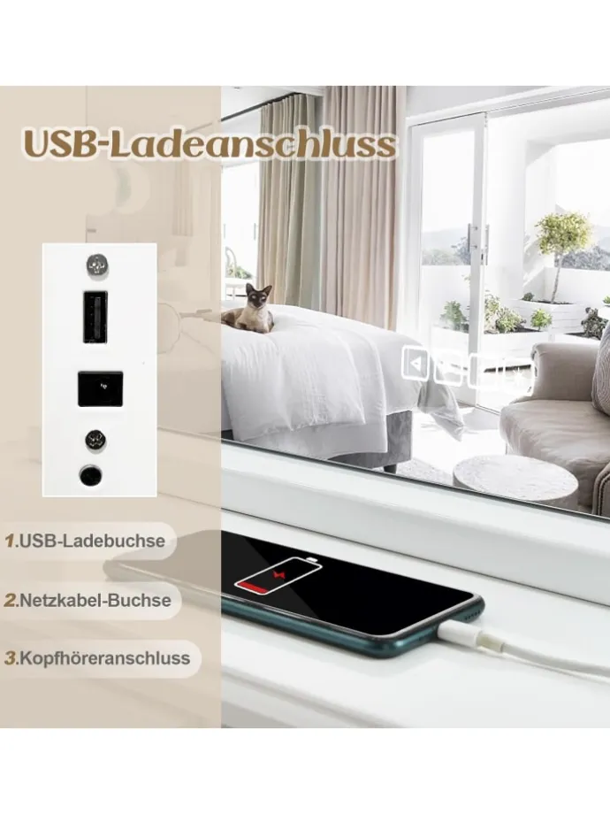 Ein USB-Ladeanschluss zum Aufladen Ihres Mobiltelefons während des Auftragens von Make-up.