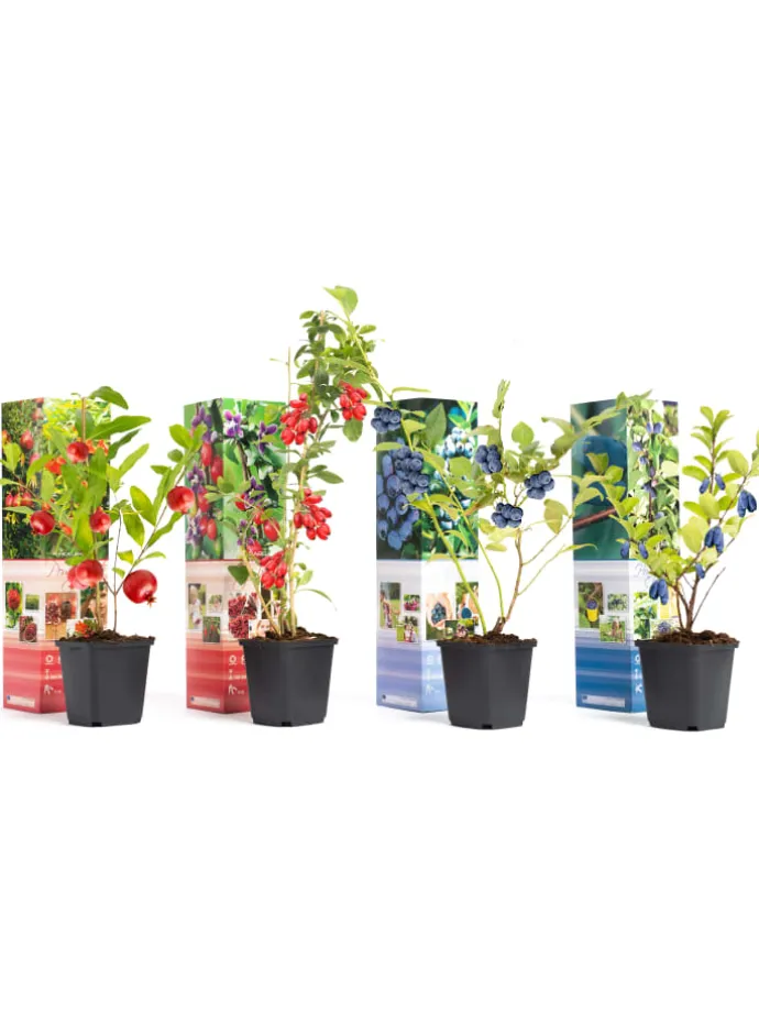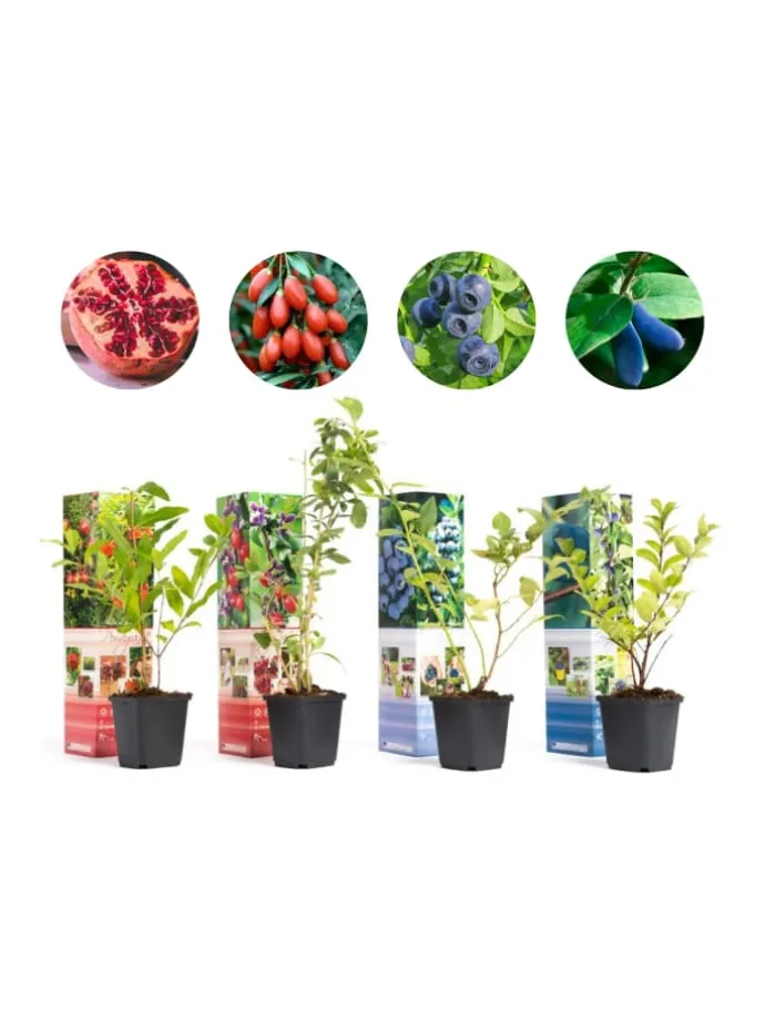 Lateinische Namen: Gojibeere: Lycium barbarum, Honigbeere: Lonicera caerulea, Heidelbeere: Vaccinium corymbosum, Granatapfel: Punica granatum