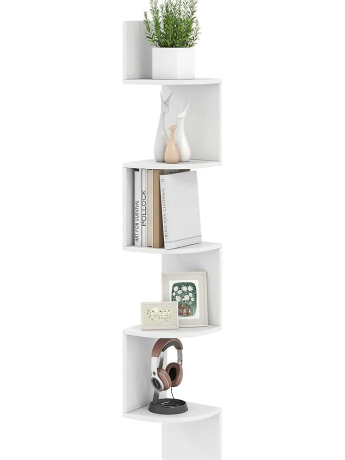 Platzsparende Ergänzung für kleine Räume dank des Eckregaldesigns