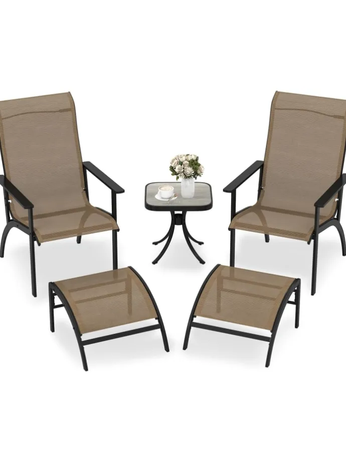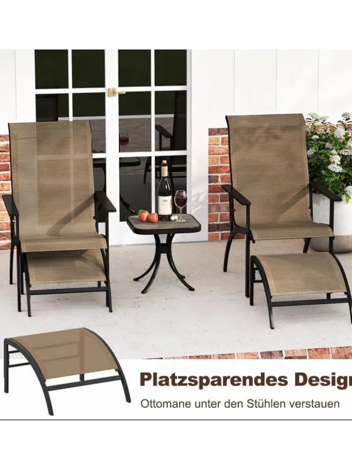 Erleben Sie die perfekte Mischung aus Komfort, Stil und Praktikabilität mit unserem 5-teiligen Terrassenmöbel-Set. Dieses Outdoor-Set umfasst 2 Terrassenstühle mit hohen, ergonomisch geformten Rückenlehnen, breiten, konturierten Sitzen und bequemen Armlehnen, die endlose Stunden Komfort versprechen. Darüber hinaus sorgt der atmungsaktive Stoff nicht nur für kühle Sitze, sondern ist auch schnelltrocknend, abriebfest und farbbeständig, was die Wartung zum Kinderspiel macht. Für zusätzliche Funktionalität verfügt das Balkonmöbel-Set über platzsparende Fußhocker.