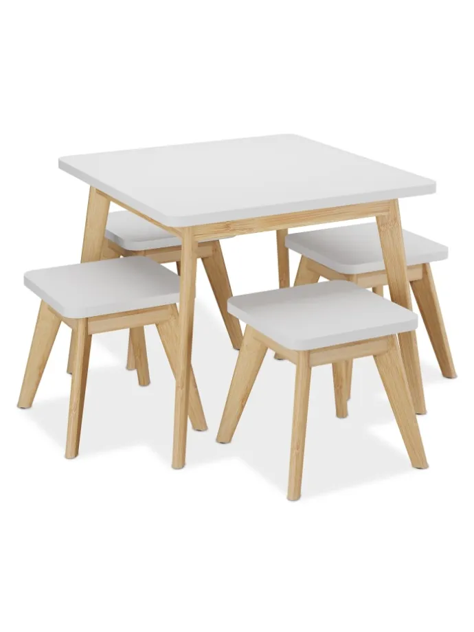Diese Kindersitzgruppe ist eine tolle Sitzgelegenheit für das Kinderzimmer und fügt sich überall gut ein. Das 5-teilige Set besteht aus einem Kindertisch und 4 Hockern. Lass Deine Kleinen selbstständig an dem Basteltisch malen, spielen oder essen. Dank der niedrigen Sitz- und Tischhöhe können 4 Kinder bequem auf der Kinder-Sitzgarnitur Platz nehmen und sich wie die Großen fühlen. Die Beine aus natürlichem Bambus setzen dekorative Akzente und sorgen zugleich für einen sicheren Stand.