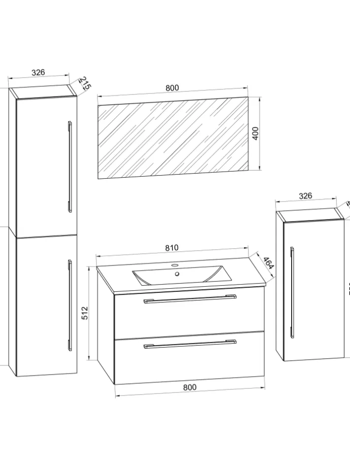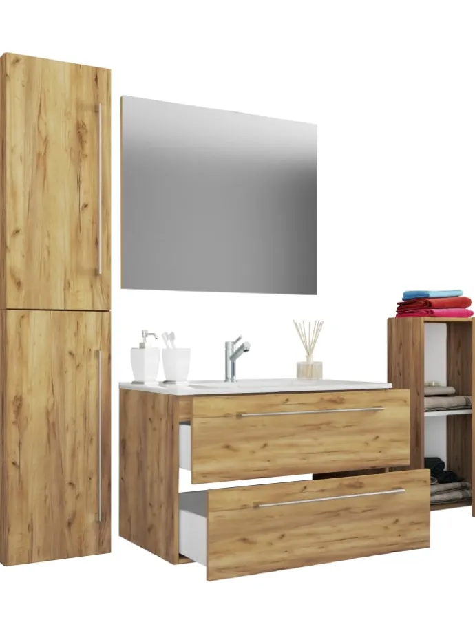 – Set: Unterschrank, Waschbecken, Midischrank, Hochschrank, Spiegel