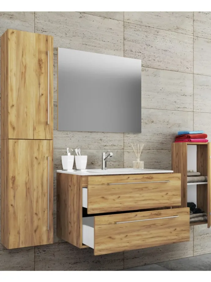 Das Badmöbel-Set besteht aus einem Hochschrank und einem Midischrank, sowie einem Unterschrank mit zwei Schubladen auf robusten Meteallschienen und zwei Seitenschränken.