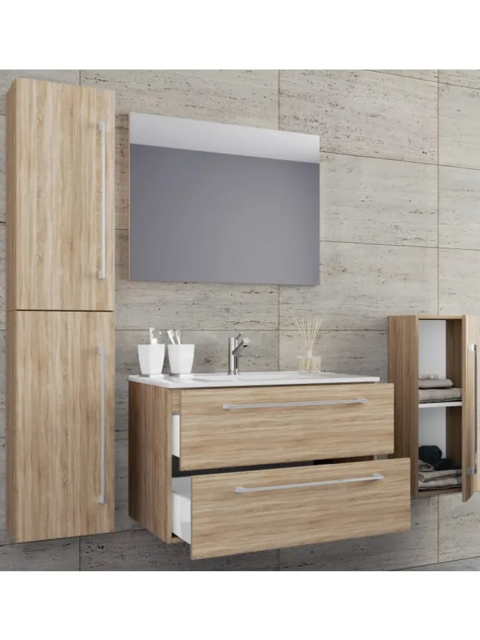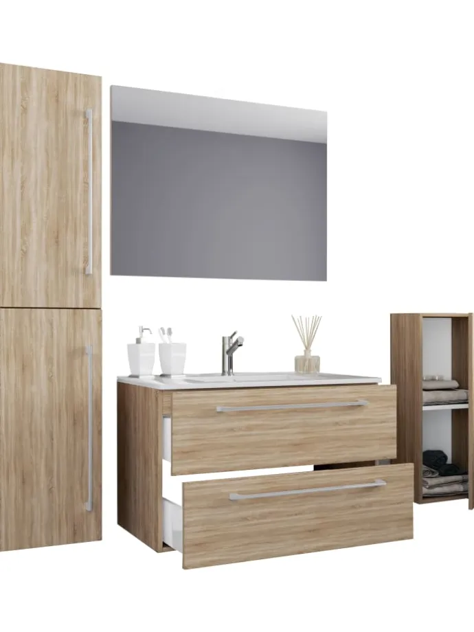 Das Badmöbel-Set besteht aus einem Hochschrank und einem Midischrank, sowie einem Unterschrank mit zwei Schubladen auf robusten Meteallschienen und zwei Seitenschränken.