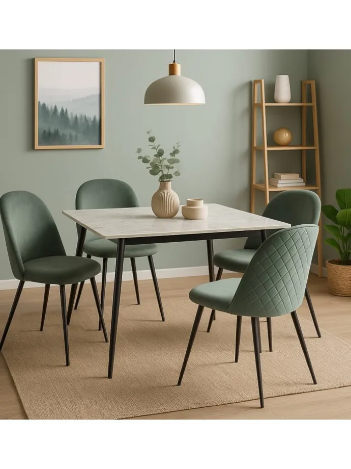 Diese hochwertige Tischgruppe ist ein echtes Highlight für jedes Esszimmer oder die offene Wohnküche. Der großzügige Esstisch mit einer edlen, pflegeleichten Tischplatte aus gesintertem Stein in realistischer Marmoroptik verleiht deinem Zuhause ein luxuriöses Flair. Die vier komfortablen Polsterstühle mit weichem Samtbezug und stilvoller Routensteppung im Rückenbereich sorgen für gemütliche Stunden beim Essen oder Beisammensitzen.