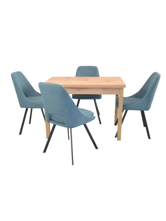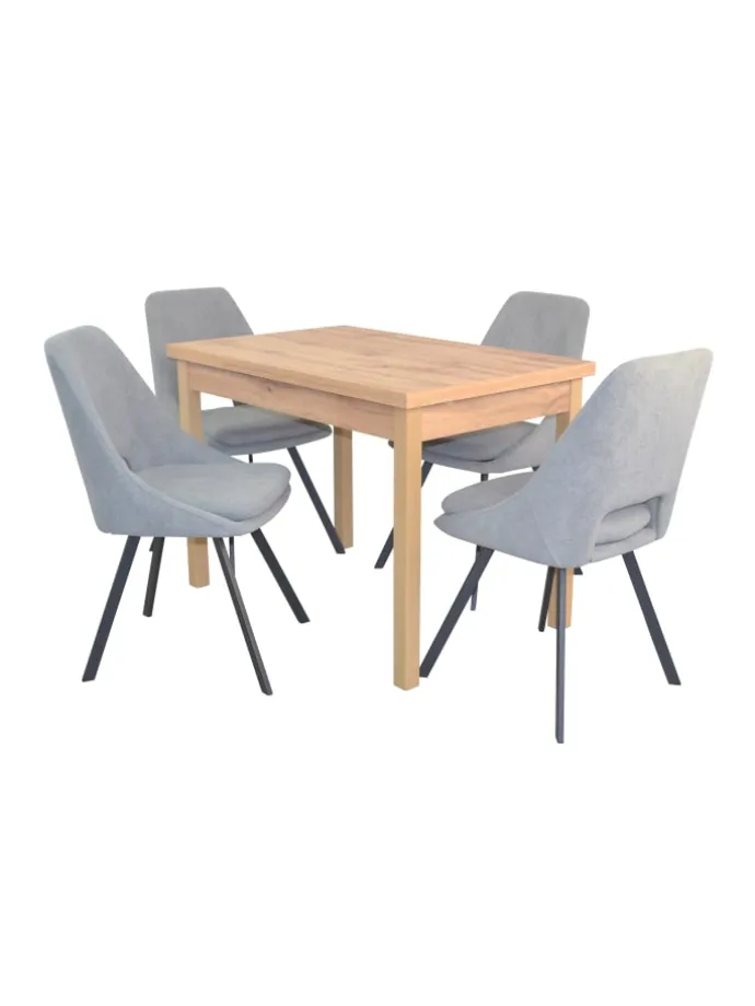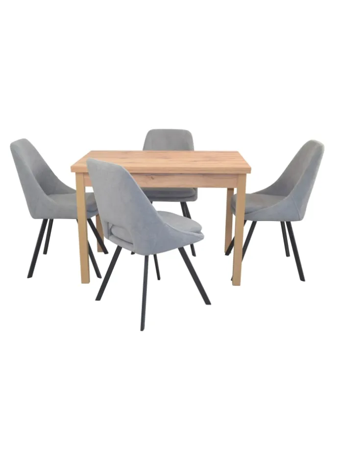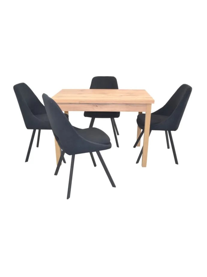 5teilige Tischgruppe bestehend aus 4 Stühlen und 1 Esstisch mit Auszugsfunktion. Esstisch mit vier Beinen aus Massivholz Buche, eichefarben gebeizt und lackiert. Tischplatten aus Holzwerkstoff mit einer Melaminbeschichtung, eichefarben. Unter der Tischplatte sind rechts/links jeweils eine ca. 30 cm Ansteckplatte eingeschoben. Diese lassen sich einfach und schnell ausziehen, so ist die Tischplatte von 104 cm bis auf gesamt 164 cm vergrößerbar. Maße ca. cm: Breite 104-164 cm, Tiefe 67 cm, Höhe ca. 75 cm. Esszimmerstuhl (4Stück) haben ein stabiles 4-Fuß-Metallgestell, schwarz pulverbeschichtet. Die bequeme Sitzschalte und das feste Sitzkissen sind komplett schaumstoffgepolstert und mit einem unifarbenen Stoffbezug in Teddyoptik (100% Polyester), bezogen. Maße ca. cm: (B/H/T) 48/86/55. Sitzhöhe ca. 48 cm, Sitztiefe 43 cm, Sitzbreite 40 cm. Belastbgarkeit ca. 130 kg. Lieferung der Stühle und vom Esstisch erfolgt zur Selbstmontage, inklusive Aufbauanleitung.