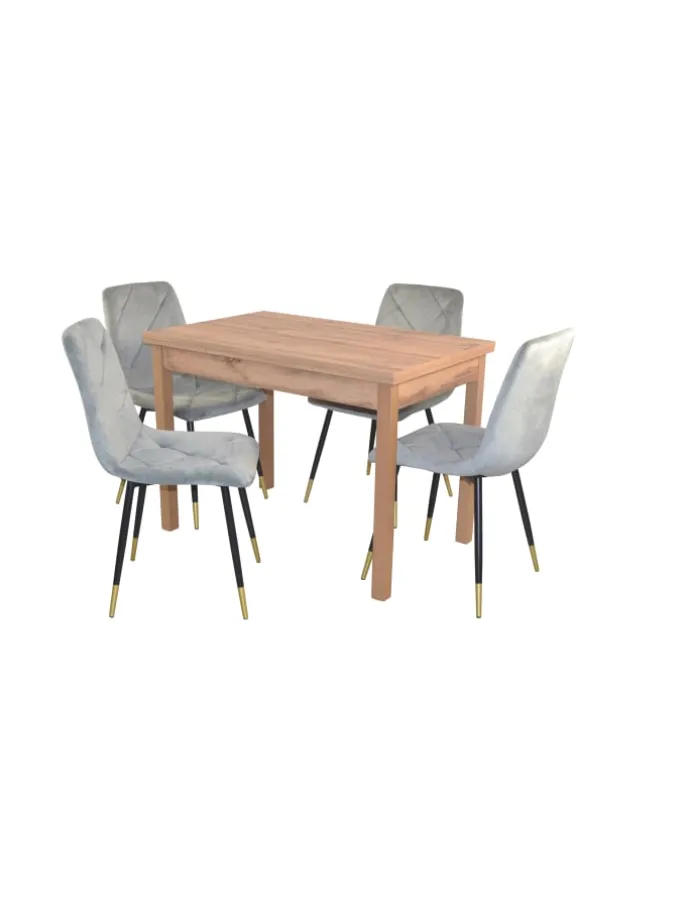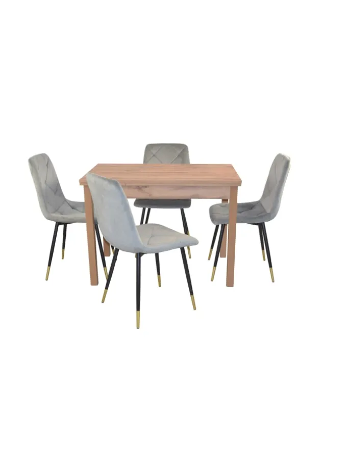 Moderne 5tlg. Tischgruppe bestehend aus einem Esstisch mit Auszugsfunktion und vier Polsterstühlen. Die Beine der 4-Fußstühle sind aus Stahlrohr, schwarz pulverbeschichtet im unteren Drittel goldfarben. Sitz und Rücken sind bequem schaumstoffgepolstert und mit einem attraktiven Stoffbezug in Samtoptik (100% Polyester) bezogen. Rücken mit schöner Routensteppung. Die Beine vom Esstisch sind aus Massivholz Buche, eichefarben gebeizt und lackiert. Tischplatte und die Ansteckplatten sind aus Holzwerkstoff gefertigt und mit einem hochwertigen Melamin-Holzdekor, eichefarben, beschichtet. Rechts/links jeweils eine ca. 30 cm breite Ansteckplatte, dadurch ist der Esstisch schnell und einfach von 104 cm bis auf gesamt 164 cm vergrößerbar. Auch einzeln ausziehbar. Lieferung der Stühle und Esstisch erfolgt zur Selbstmontage, inklusive Aufbauanleitung. Maße ca. cm: Esstisch (B/H/T) 104-164/75/67. Je Stuhl (B/H/T) 50/86/56. Sitzhöhe ca. 48 cm, Sitztiefe ca. 45 cm.