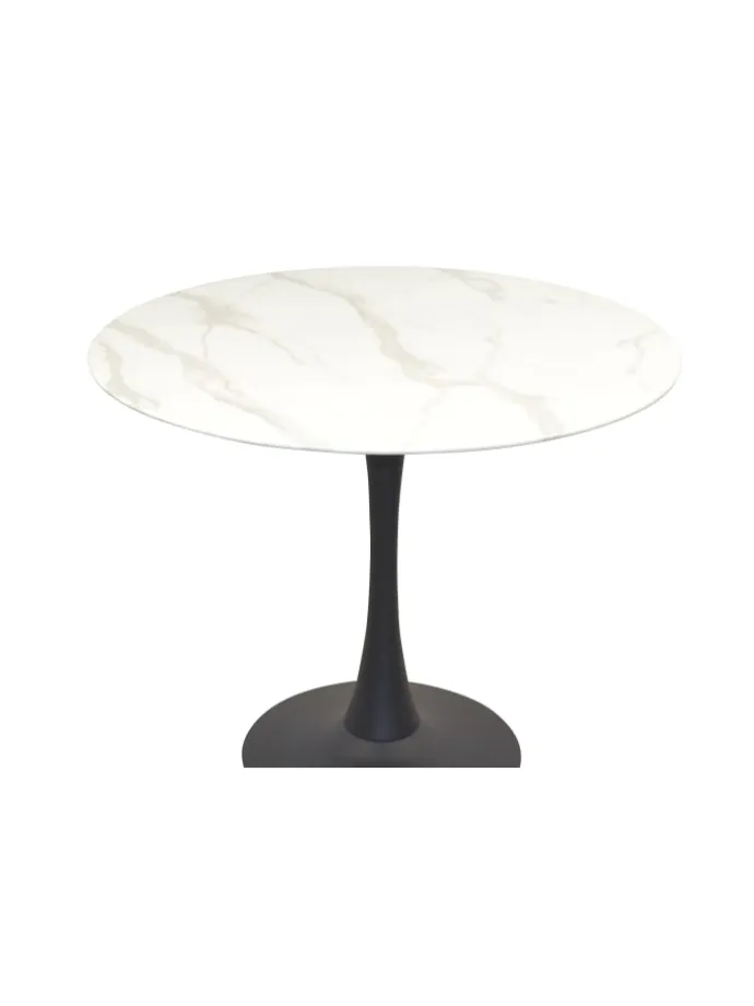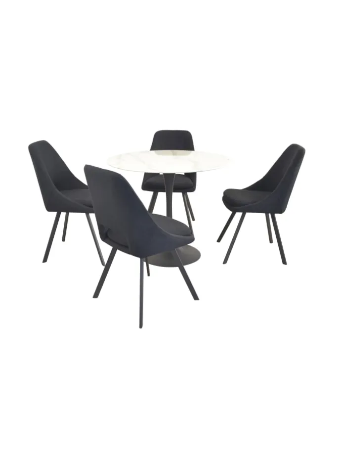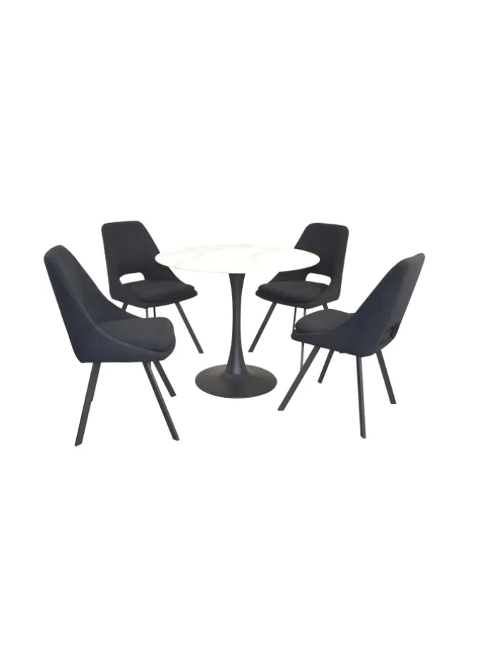 Moderne 5teilige Tischgruppe bestehend aus einem Esstisch und vier Stühlen. Esstisch (90 cm Durchmesser) mit einem stabilen Metall-Säulenfuß, matt schwarz, pulverbeschichtet. Oben eine runde Tischplatte aus Sicherheitsglas, mit Marmoroptik, weiß. Maße ca. cm: (ØxH) 90×75. Tischplatte ca. 0,8 cm stark. Standfuß Ø49 cm. Moderner Esszimmerstuhl mit Beinen aus Stahlrohr, schwarz pulverbeschichtet. Die bequeme Sitzschalte und das feste Sitzkissen sind komplett schaumstoffgepolstert und mit einem unifarbenen Stoffbezug in Teddyoptik (100% Polyester), bezogen. Maße ca. cm: (B/H/T) 48/86/55. Sitzhöhe ca. 48 cm, Sitztiefe 43 cm, Sitzbreite 40 cm. Belastbgarkeit ca. 130 kg. Lieferung vom Esstisch und der Stühle erfolgt zur Selbstmontage, inklusive Aufbauanleitung.