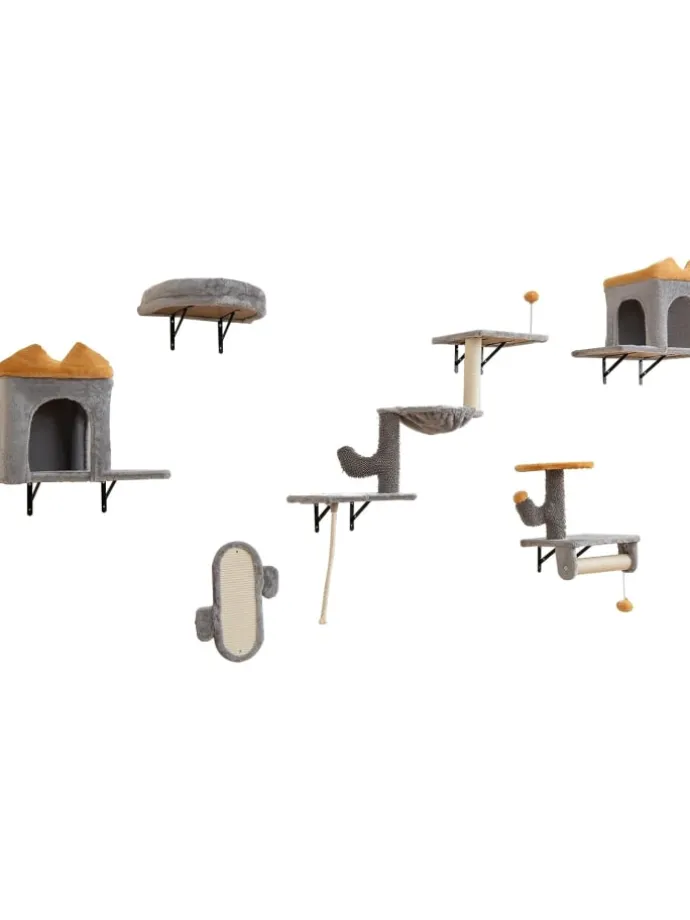 Dieses wandmontierte Katzenmöbel-Set umfasst eine 2-stufige Plattform, 2 gemütliche Katzensuiten, 1 Kratzbaum, 1 gemütliches Bett und 1 Kratzbrett und bietet ausreichend Platz zum Ausruhen, Spielen, Beobachten und Erkunden. Die Kratzstäbe und -bretter sind aus verlässlichem, natürlichem Sisal gefertigt und befriedigen den Kratzinstinkt Ihrer Katze bei langer Haltbarkeit. Zudem sorgt der robuste Metallrahmen für Sicherheit, mit abgerundeten Ecken und einer gepolsterten oberen Aufsitzfläche für Komfort. Das gepolsterte Bett verfügt über eine gepolsterte Kopfstütze und einen weichen, hautfreundlichen Stoff, wodurch Ihre Katze ein gemütliches und komfortables Wohnerlebnis genießt.